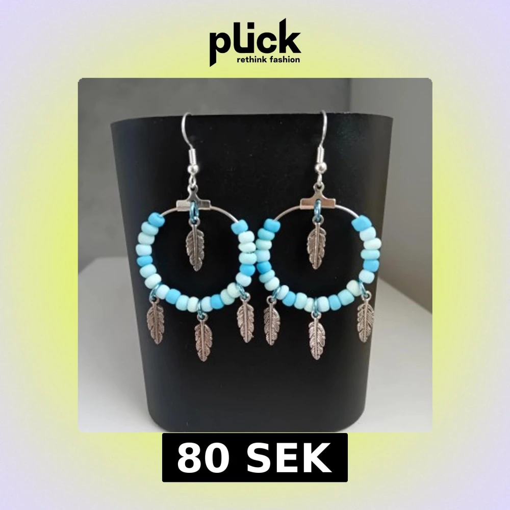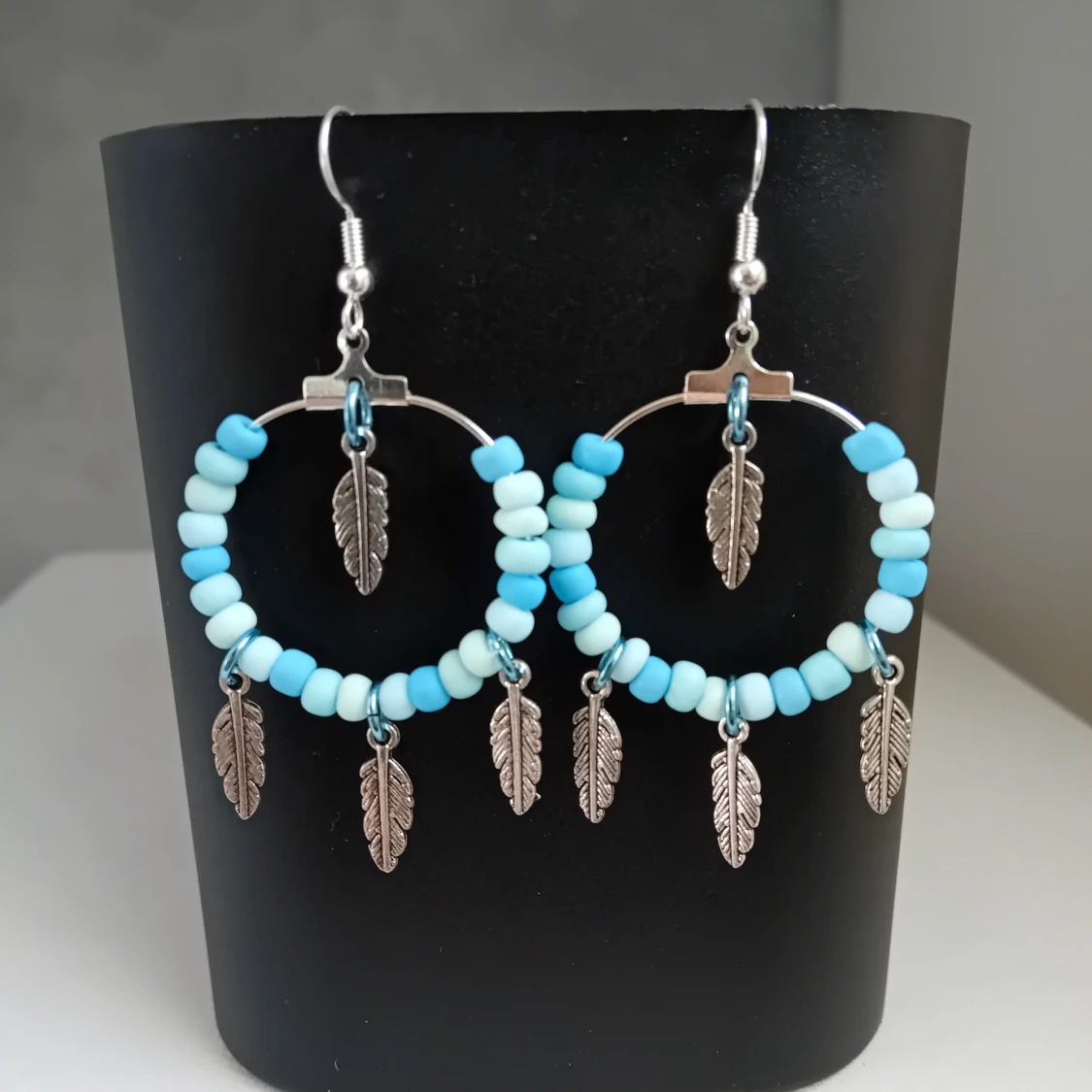 Stora runda örhängen med blå pärlor samt silverfärgade fjäderhängen. Perfekta för dig som vill ha ett bohemiskt och färgglatt smycke som sticker ut. Öronkroken är nickelsäker och aldrig använda