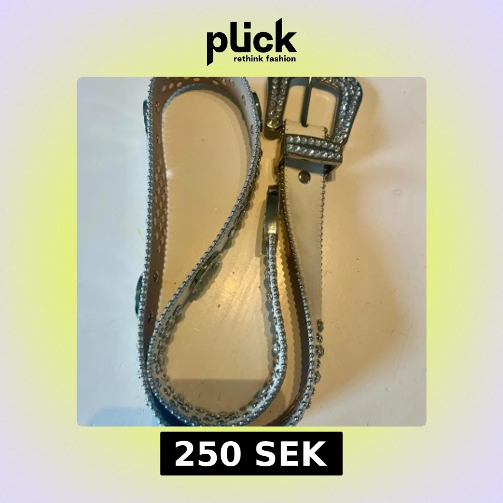 Snyggt vitt bälte med glittrande strass och nitar längs hela bandet. Spännet är dekorerat med stenar och bältet har hästskoformade detaljer i metall. Perfekt för att ge outfiten extra bling och western-vibe.