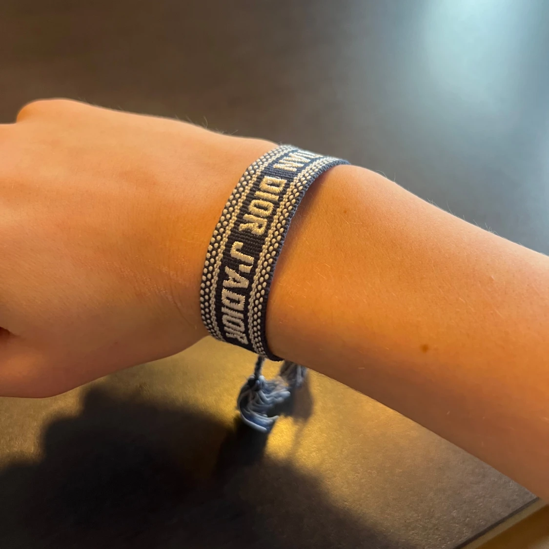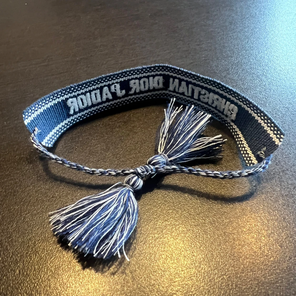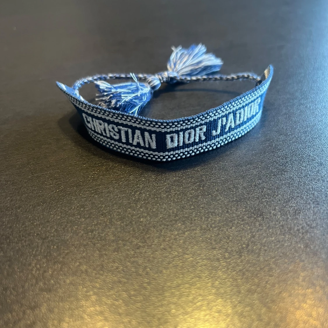 Snyggt blått armband från Christian Dior. Armbandet har en flätad design med tofsar i ändarna, vilket ger en bohemisk touch. Perfekt för att lägga till en stilfull detalj till din outfit. Hör gärna av er vid frågor och funderingar👍🙌