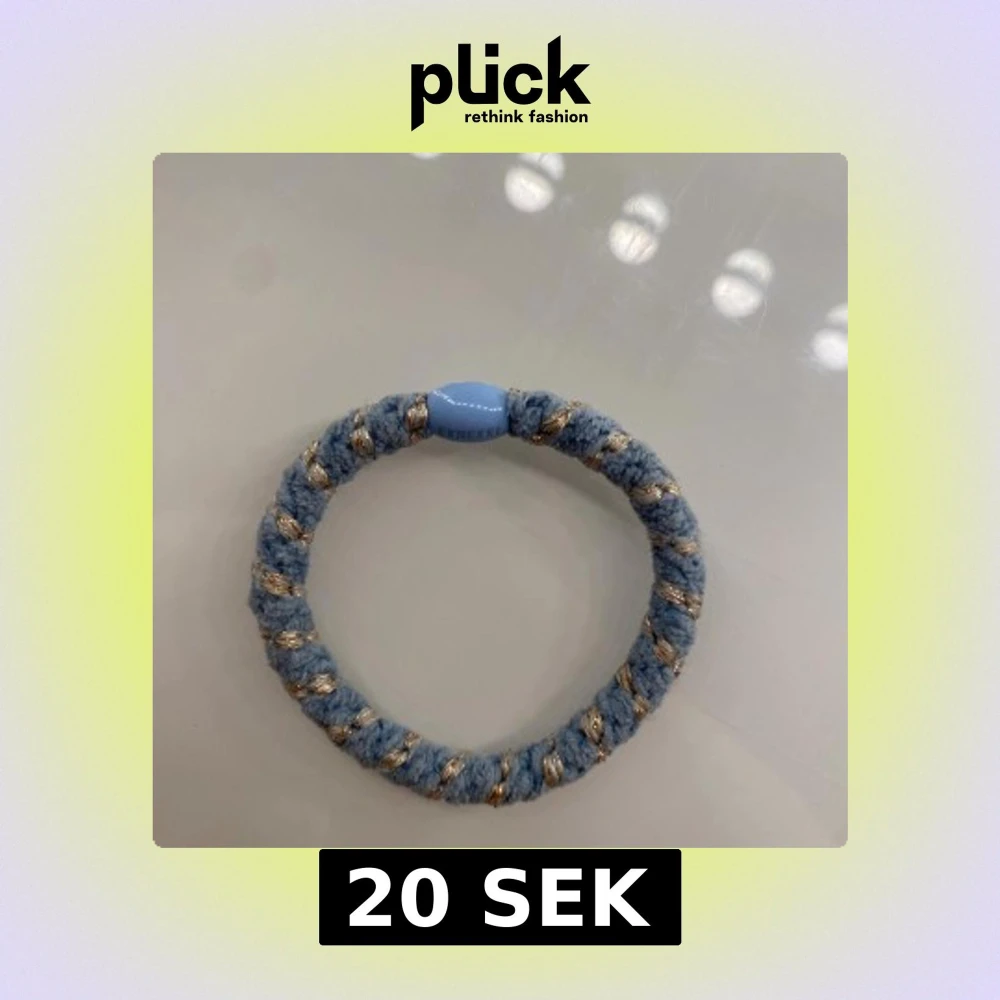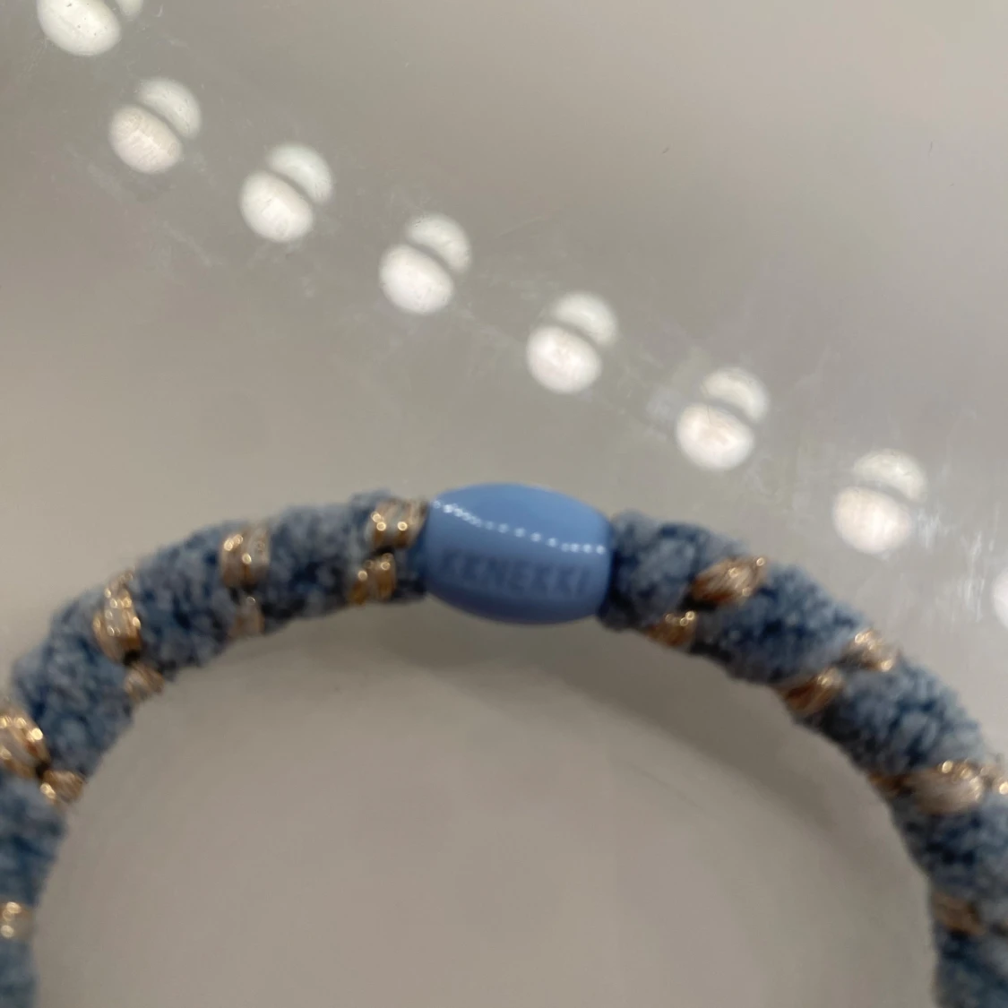 Säljer ett snyggt blått armband från Kknekki med guldiga detaljer i ett tvinnat mönster. Armbandet är gjort i ett mjukt material och har en rund form med en liten blå plastdetalj där märket står. Perfekt accessoar för att lyfta din stil.