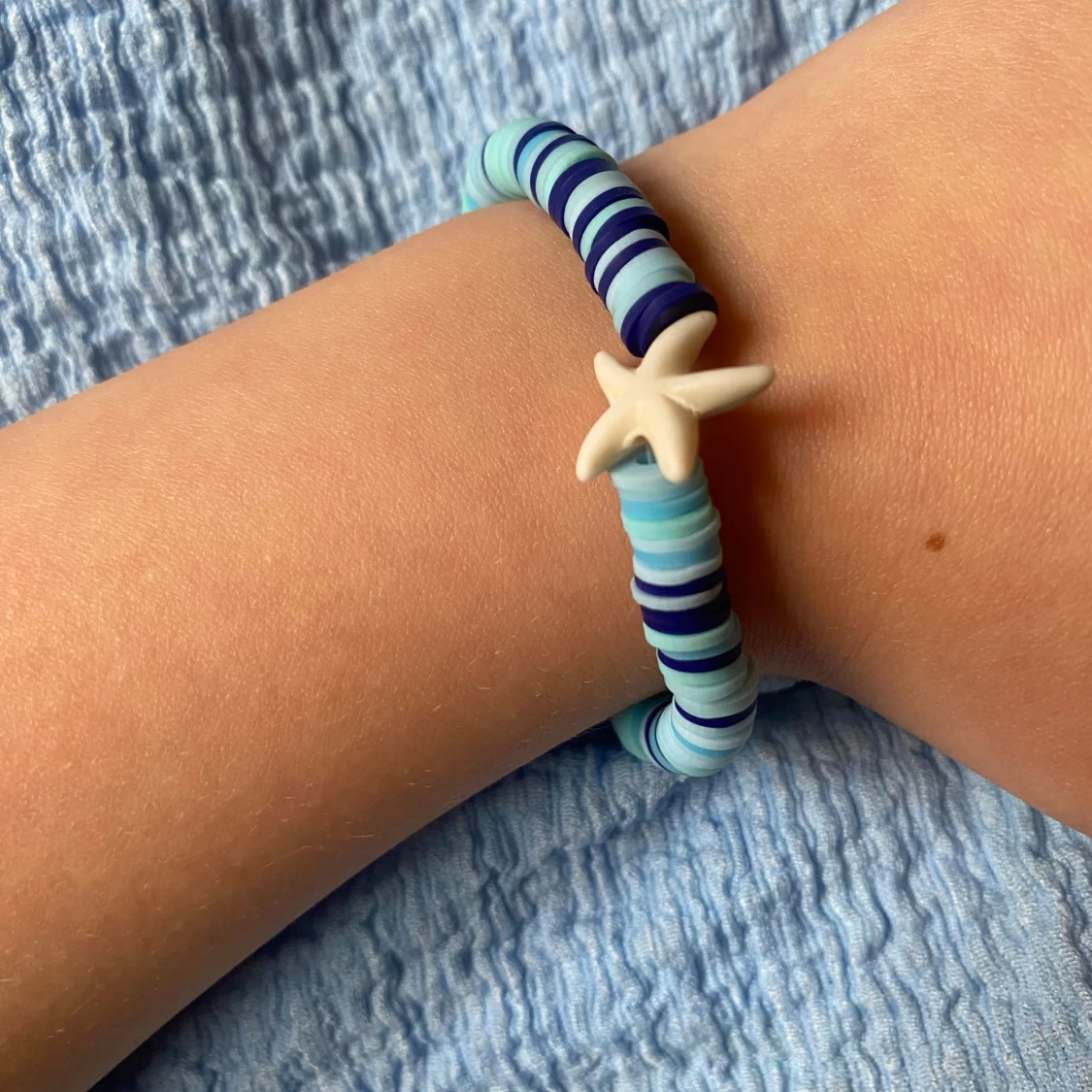Superfint armband med platta pÀrlor i olika blÄ nyanser och en vit sjöstjÀrna som detalj. Armbandet har ett strandigt vibe och Àr elastiskt sÄ det passar de flesta handleder. Perfekt accessoar för dig som Àlskar havet och coola fÀrger.