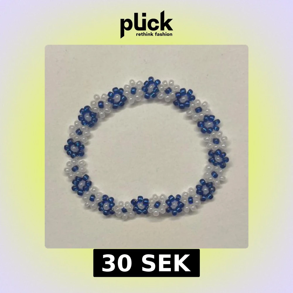 Handgjort armband med små blå och vita pärlor formade som blommor. Perfekt inför sommaren! Kan såklart göras i andra mönster och storlekar💞💞