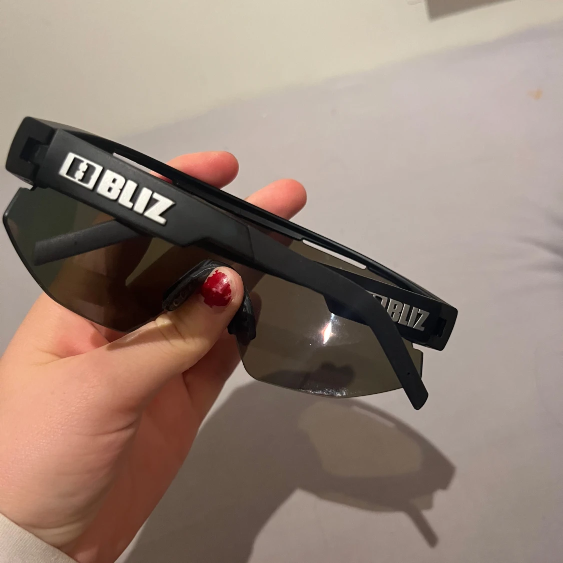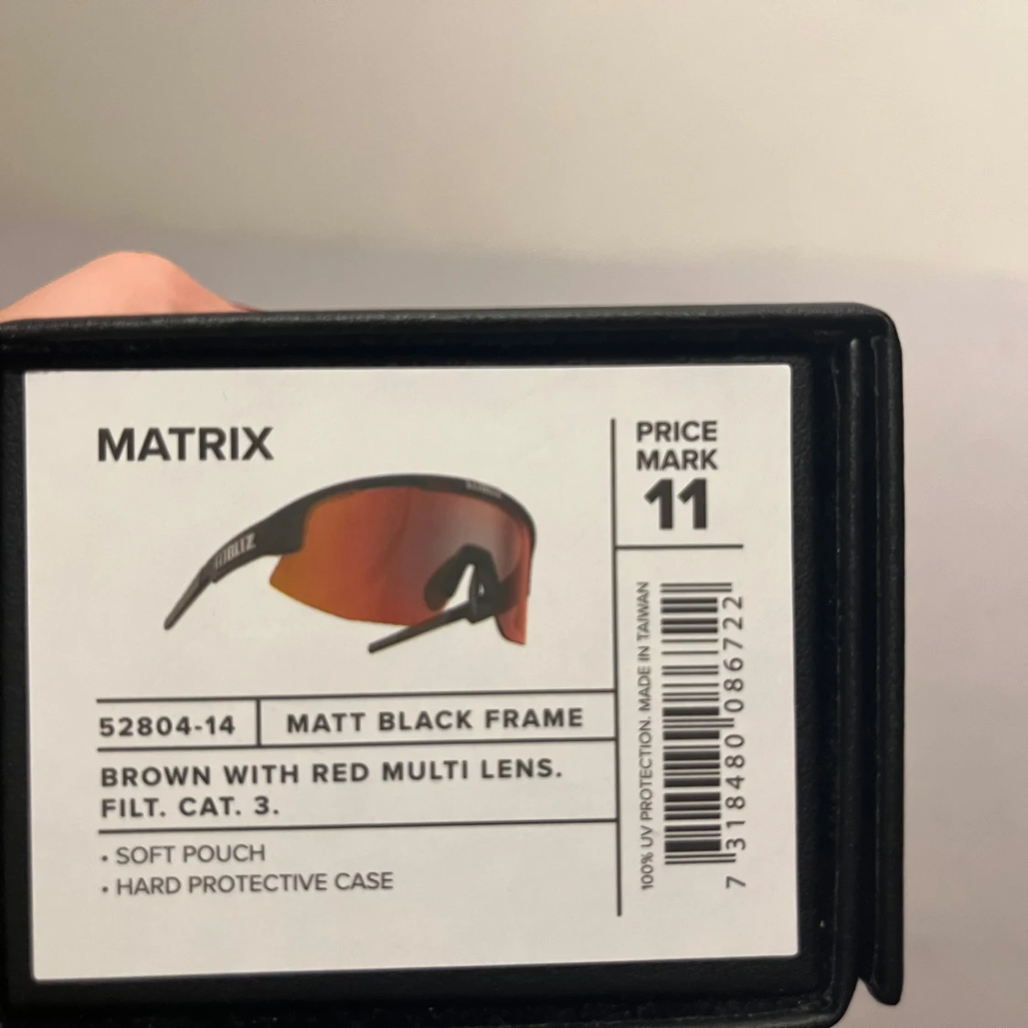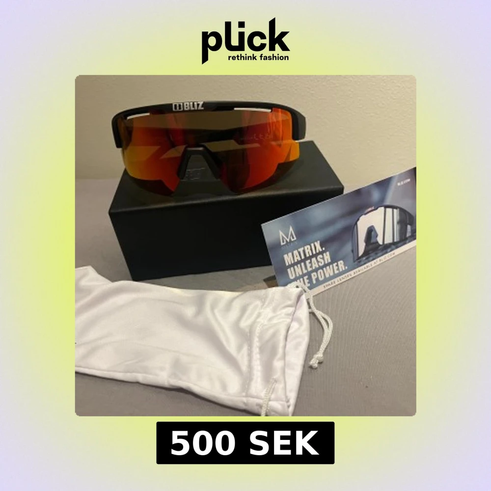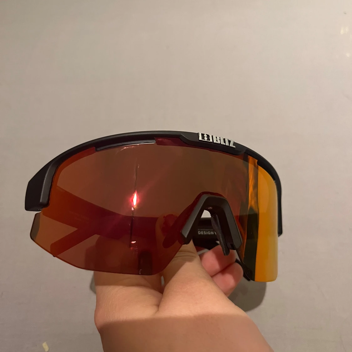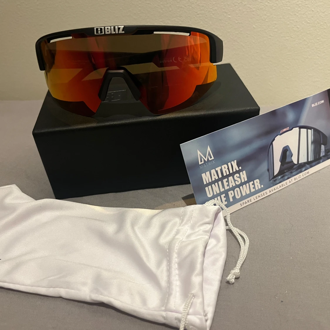 Säljer ett par Bliz Matrix sportglasögon med matt svart båge och stora röda spegellinser. Modellen har en futuristisk, svepande form och passar perfekt för cykling eller träning. Levereras med mjukt fodral och hårt skyddsetui.