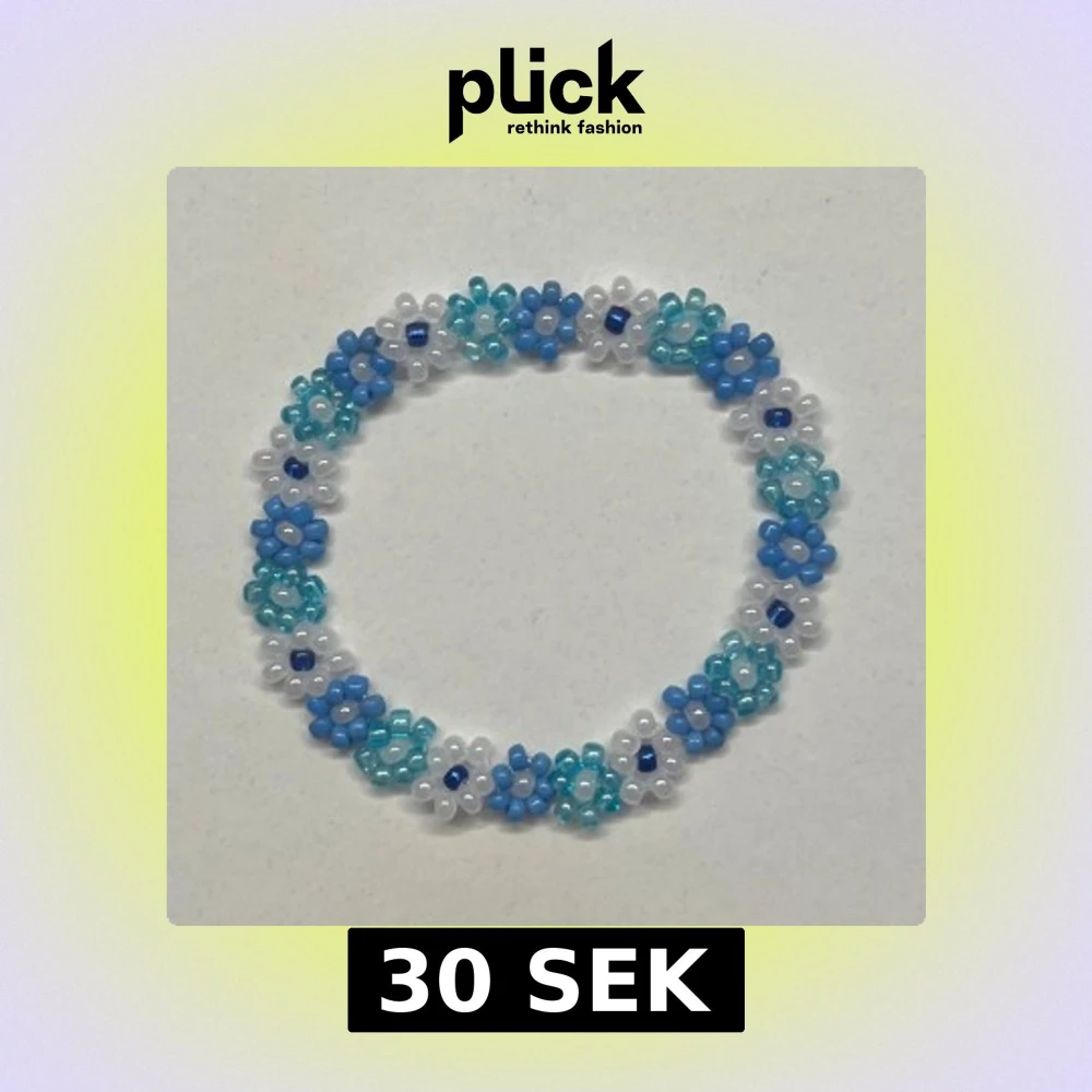 Supergulligt armband med små blommor av pärlor i blått, vitt och turkost. Armbandet är elastiskt och kan göras i andra storlekar och färger💕 Superfin accessoar!