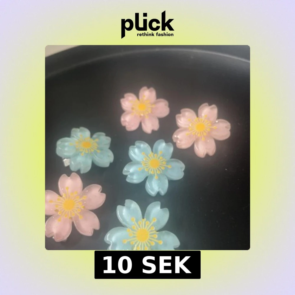 Säljer sex stycken söta hårclips formade som blommor i pastellrosa och ljusblått med gula detaljer. Perfekta för att piffa upp frisyren med en lekfull och färgglad touch. Blommorna har en mjuk, glansig finish och metallclips på baksidan.