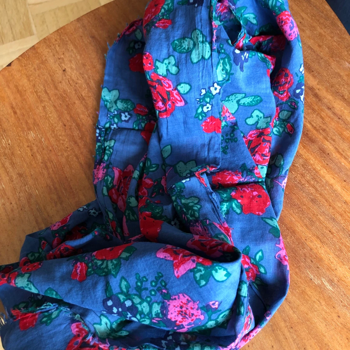 Blå sjal med blommor. Kan hämtas i Malmö, osäker på exakt fraktkostnad.