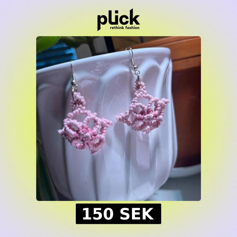 Unika örhängen med handvirkat mönster i ljusrosa. De har en geometrisk, nästan blomliknande form och hängs i klassisk krok. Perfekt för dig som gillar boho vibes och vill sticka ut med något personligt och kreativt.
