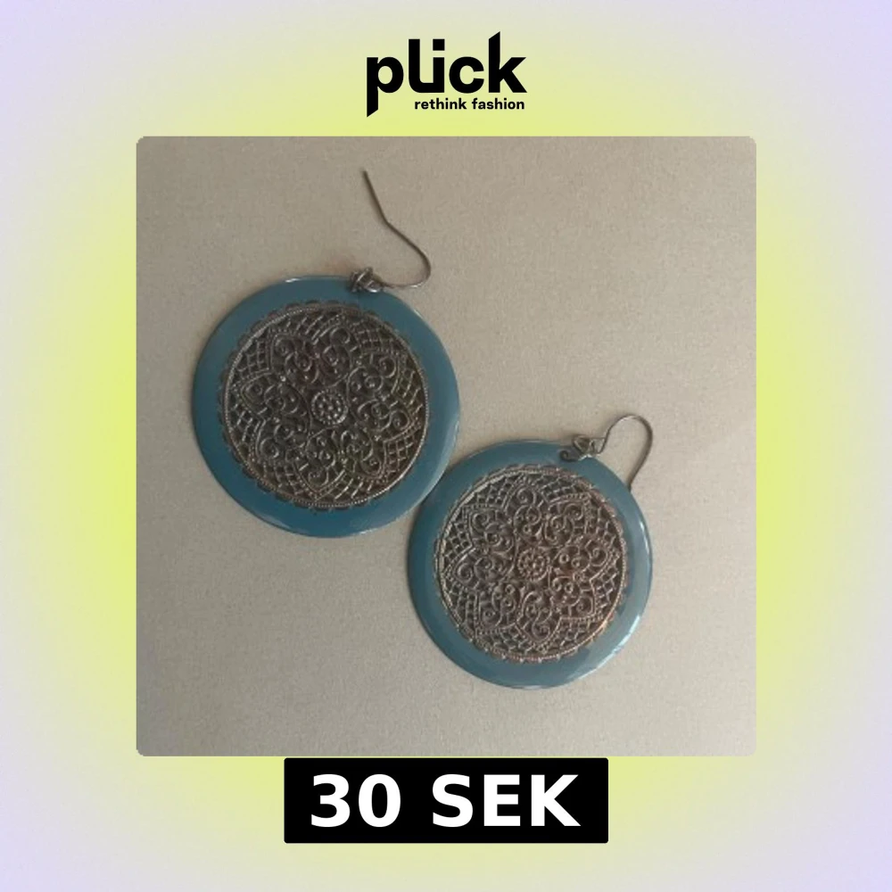 Säljer ett par stora runda örhängen med blå kant och detaljerat metallmönster i mitten. Örhängena har en vintagekänsla.