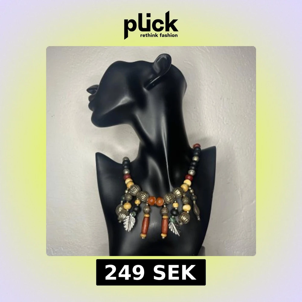 Färgstarkt vintagehalsband med stora pärlor i trä, metall och sten. Karneol-liknande orange pärlor och melerad jaspis kombineras med lövdetaljer och bohemisk design. Troligtvis från 80-/90-talet. Längd: ca 45–48 cm. Mycket gott skick. Ingen prutning, men bra rabatt vid köp av flera. Jag rensar smyckesskrin och garderob – spana in mina andra annonser! ⸻