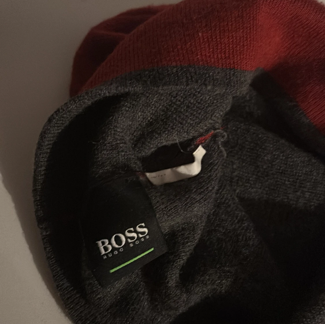 Snygg röd mössa från Hugo Boss med en diskret logga i svart. Mössan har en grå kant och är perfekt för kyliga dagar. Den är tillverkad i ett mjukt material som håller dig varm och bekväm.