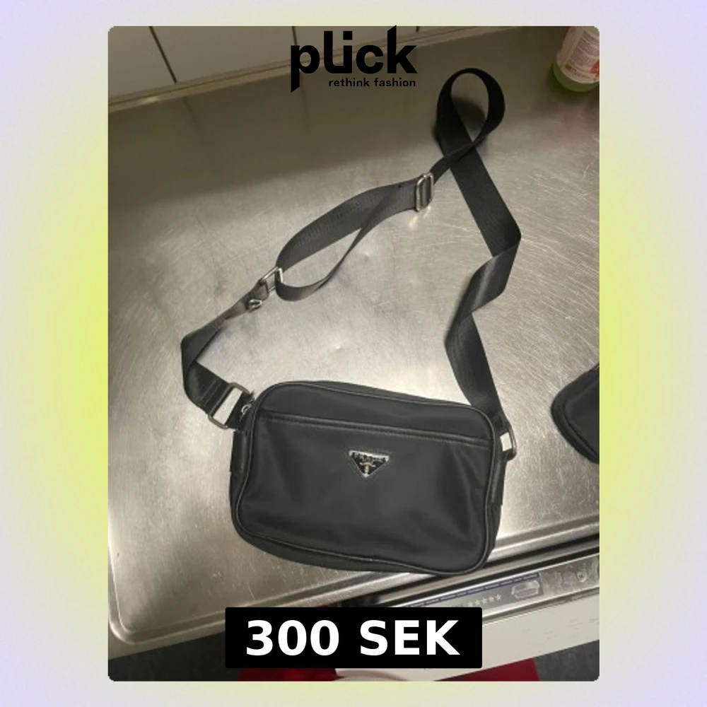 Snygg svart axelväska från Prada i nylon med justerbar rem och silverfärgade detaljer. Väskan har ett klassiskt triangulärt Prada-emblem framtill och en extra liten pouch med dragkedja som kan fästas på remmen. Perfekt storlek för det viktigaste och stilren design. Det ända felet med den är att det gick sunder och jag behövde sticka den på en av ärmena som man ser på bilden