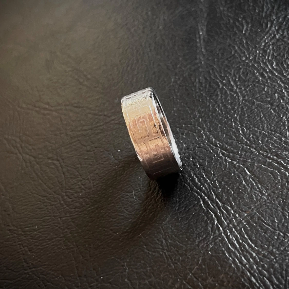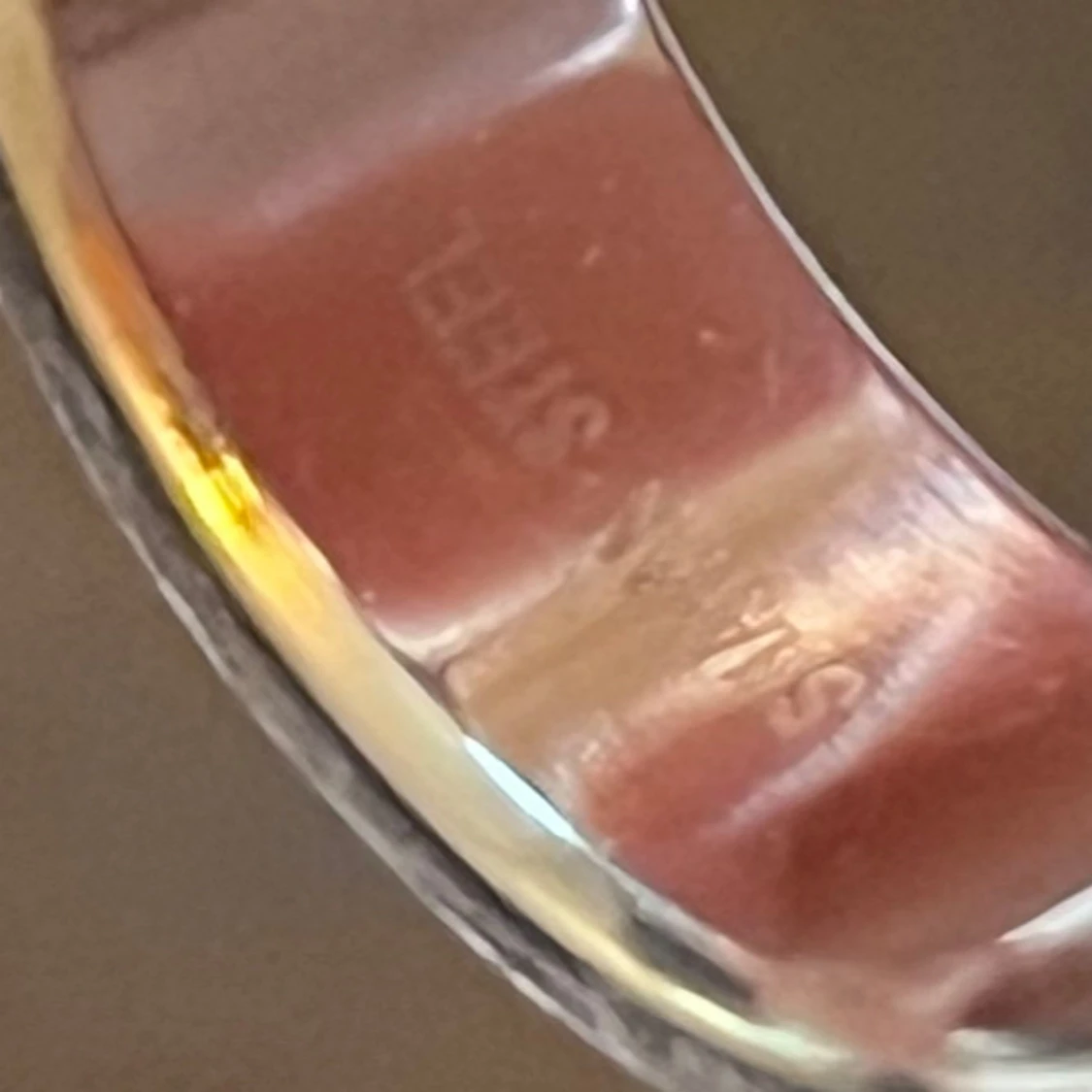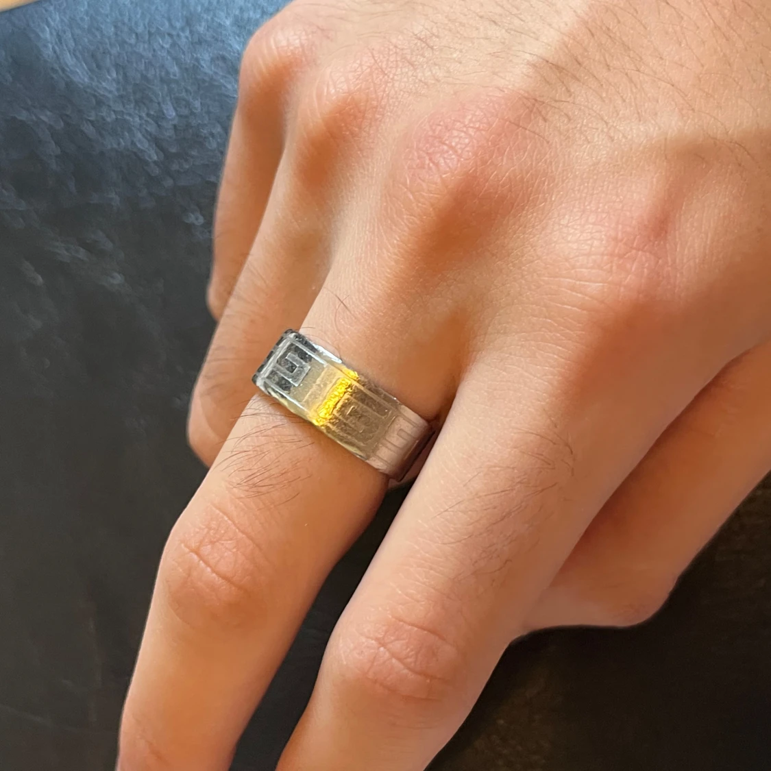 Size:10.0-10.5 Säljer en bred ring i blankt stål med ett graverat geometriskt mönster runt hela ringen. Ringen har en cool, modern vibe och passar perfekt om du gillar chunky accessoarer. Materialet är stainless steel vilket gör den tålig och stilren.