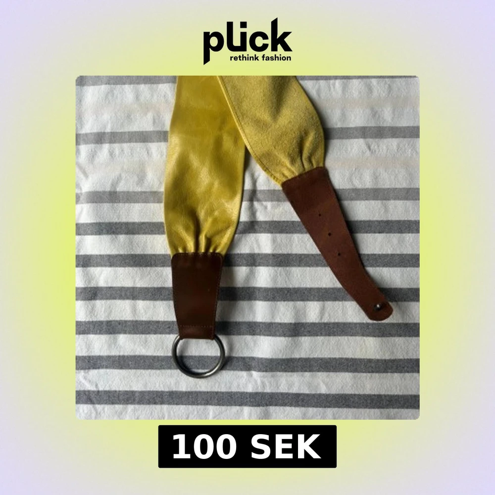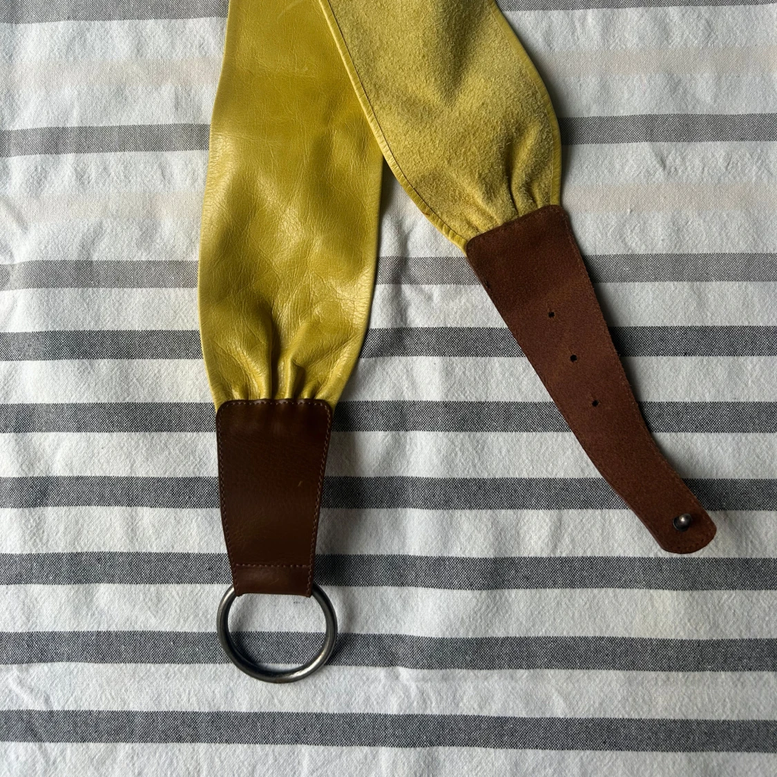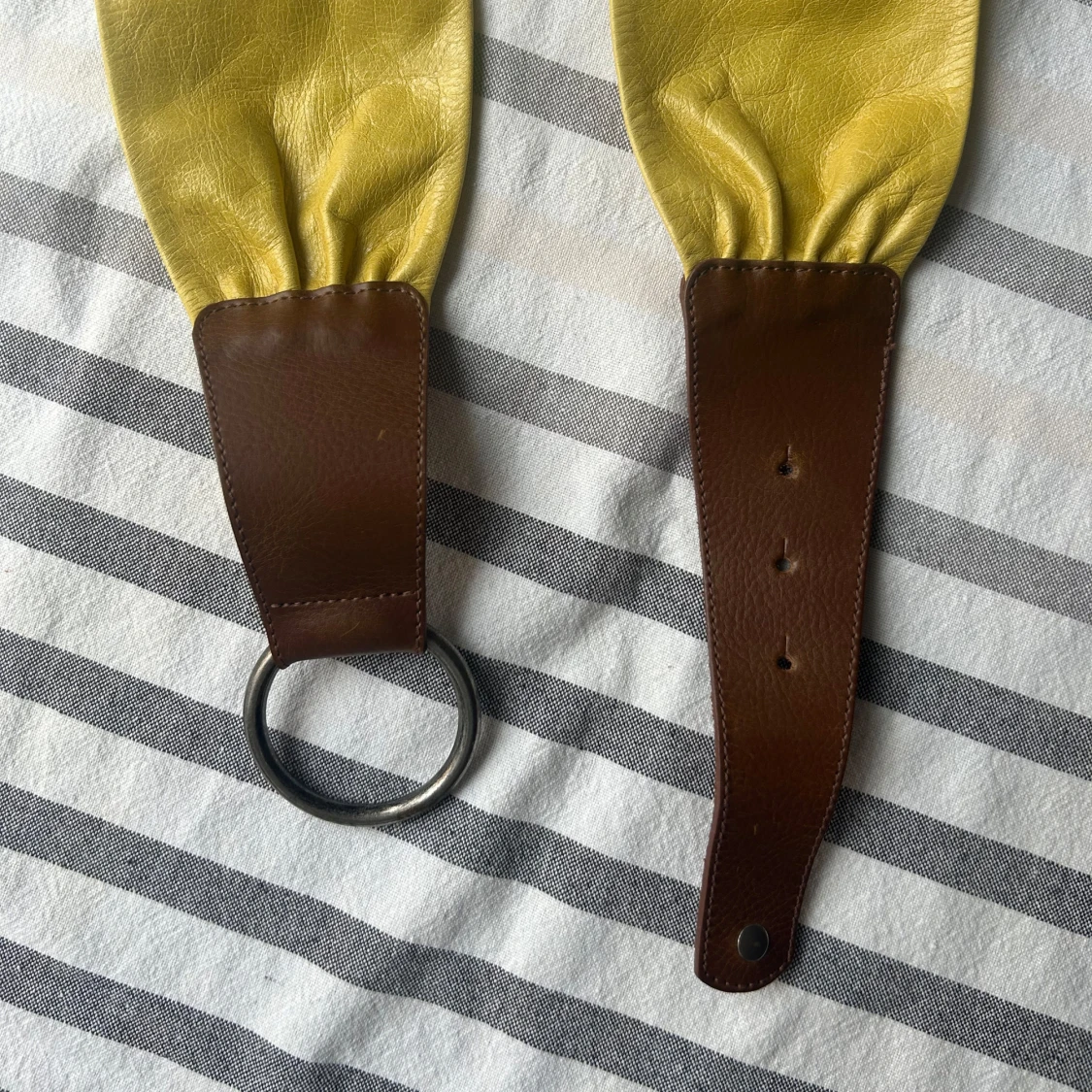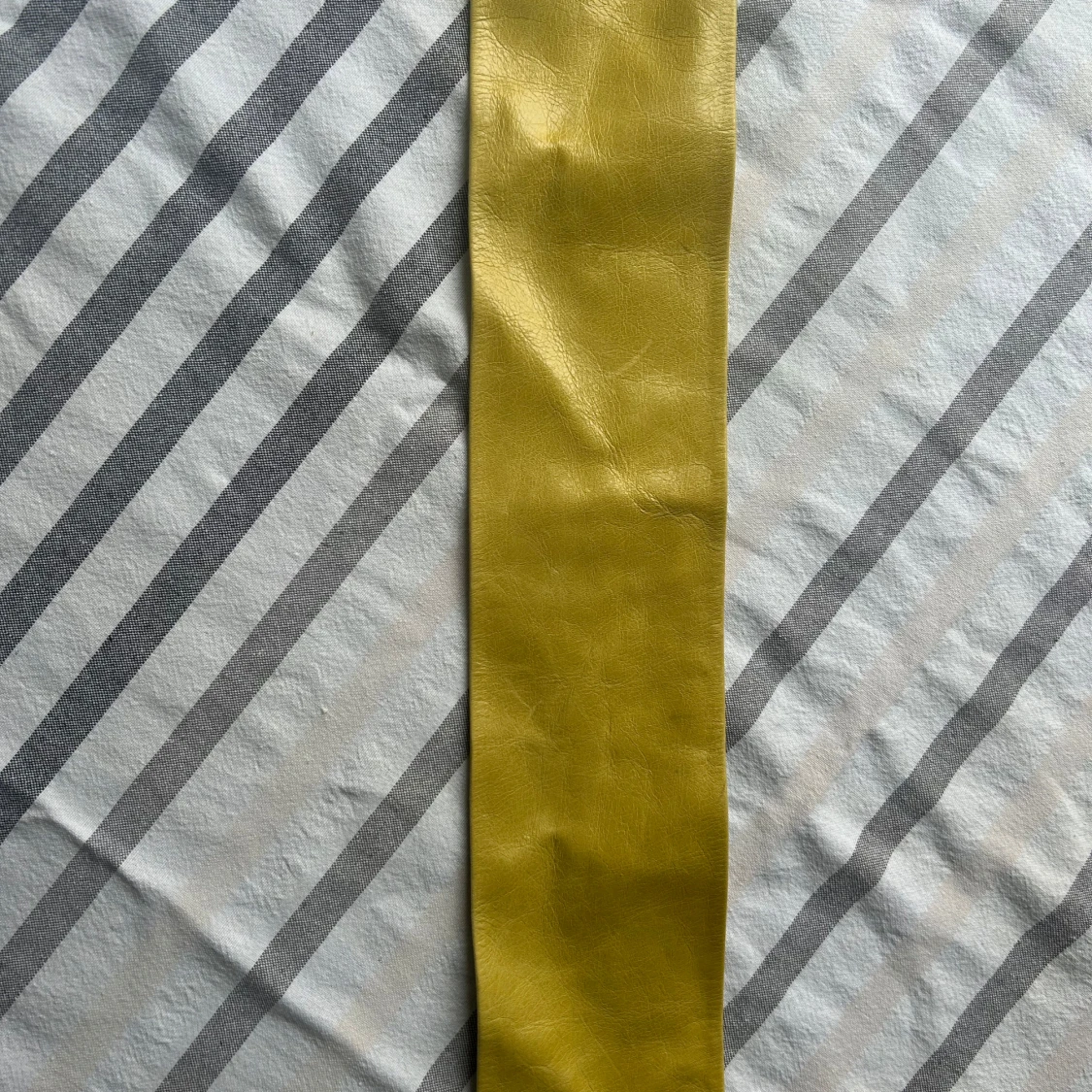 Gult midjebälte i skinn med silverfärgad ring som spänne.