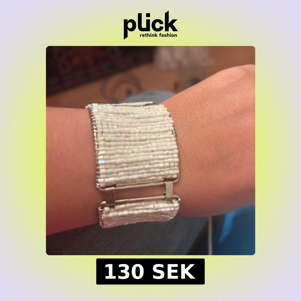 Unikt och brett armband med små vita pärlor i flera rader, fäst på silverfärgade metallramar. Armbandet har en cool, geometrisk design och stängs med en metallkedja. Perfekt för dig som gillar statement-smycken och vill sticka ut med något annorlunda.