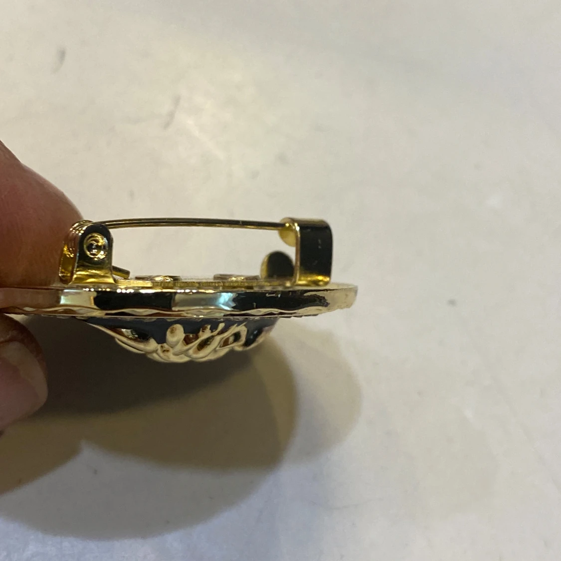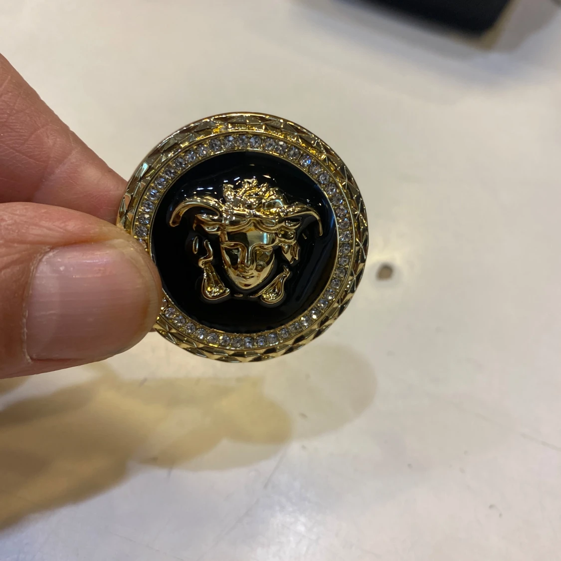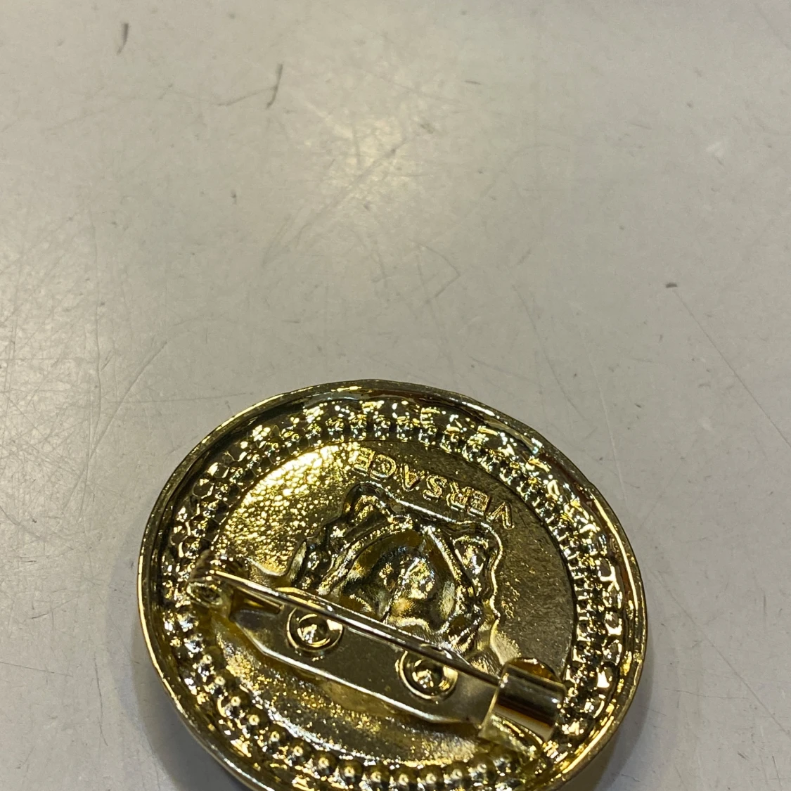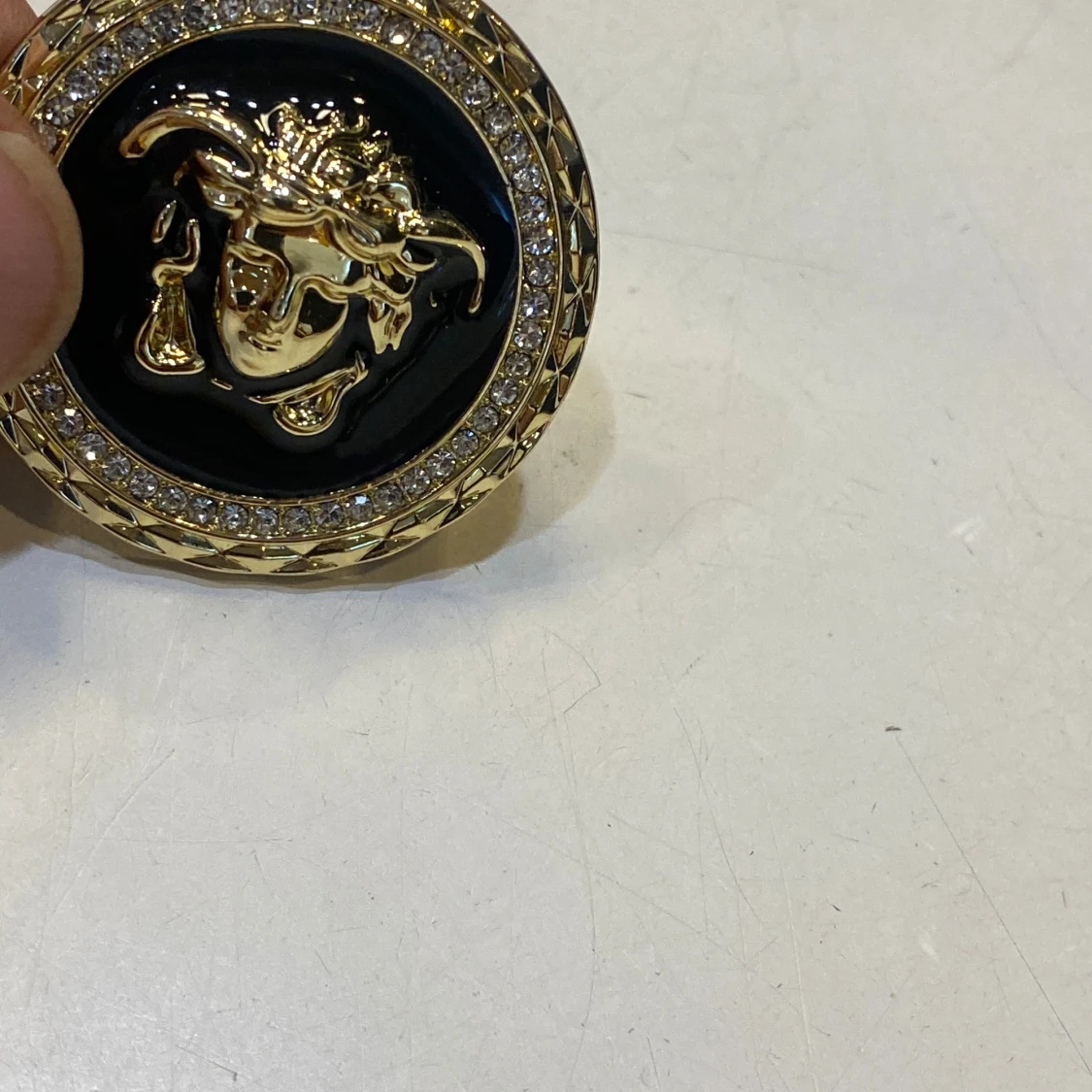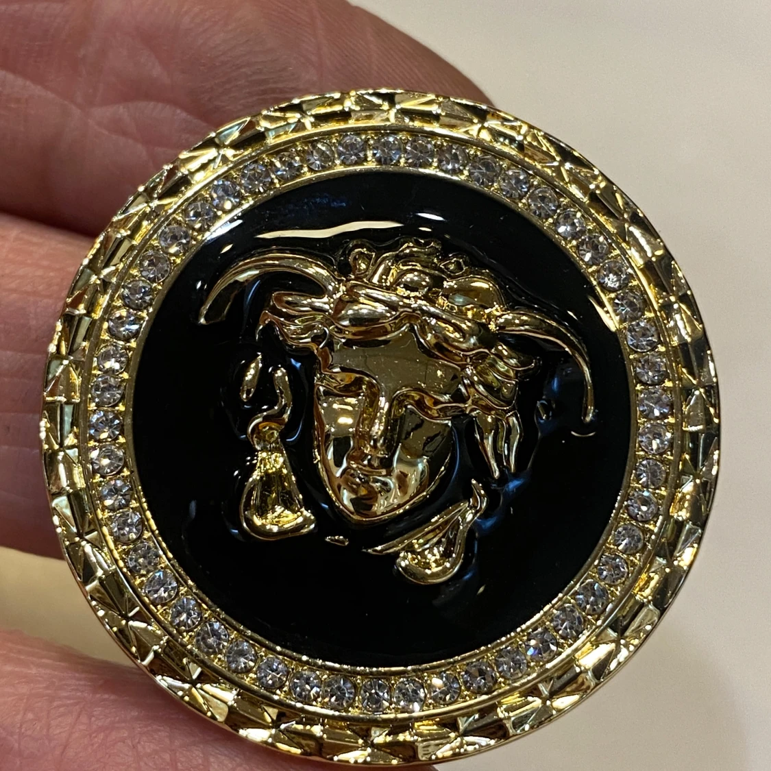 Säljer en rund brosch med Medusa-huvud i guld på svart bakgrund. Runt kanten sitter gnistrande stenar som ger extra bling. Broschen är i metall med tydlig logga på baksidan och säkerhetsnål för enkel fastsättning.