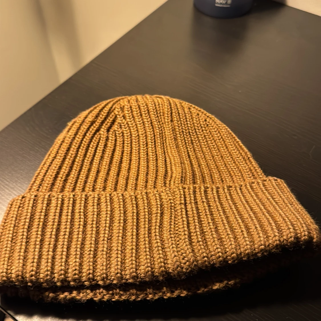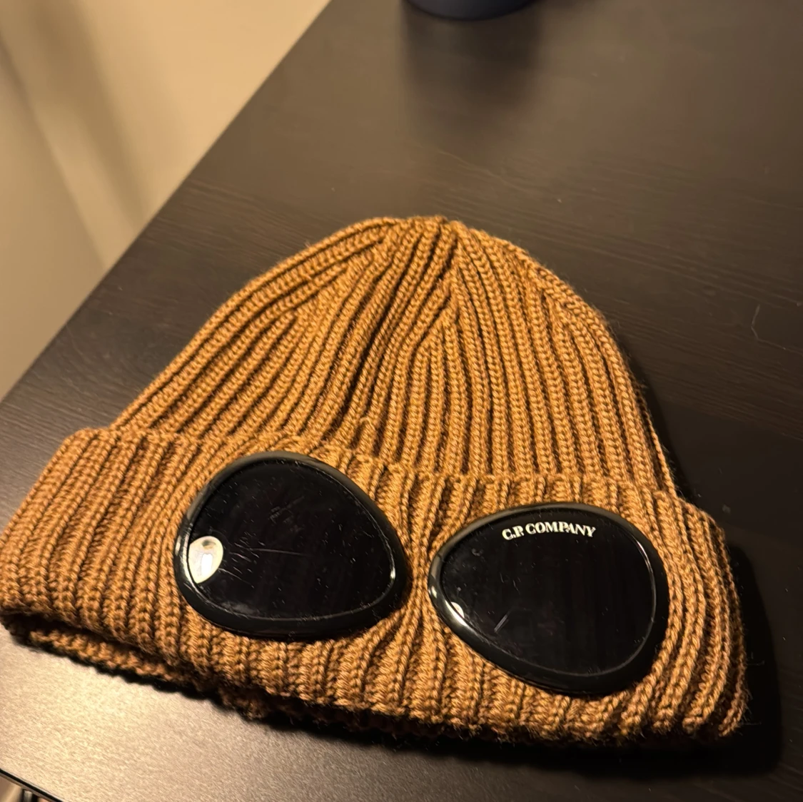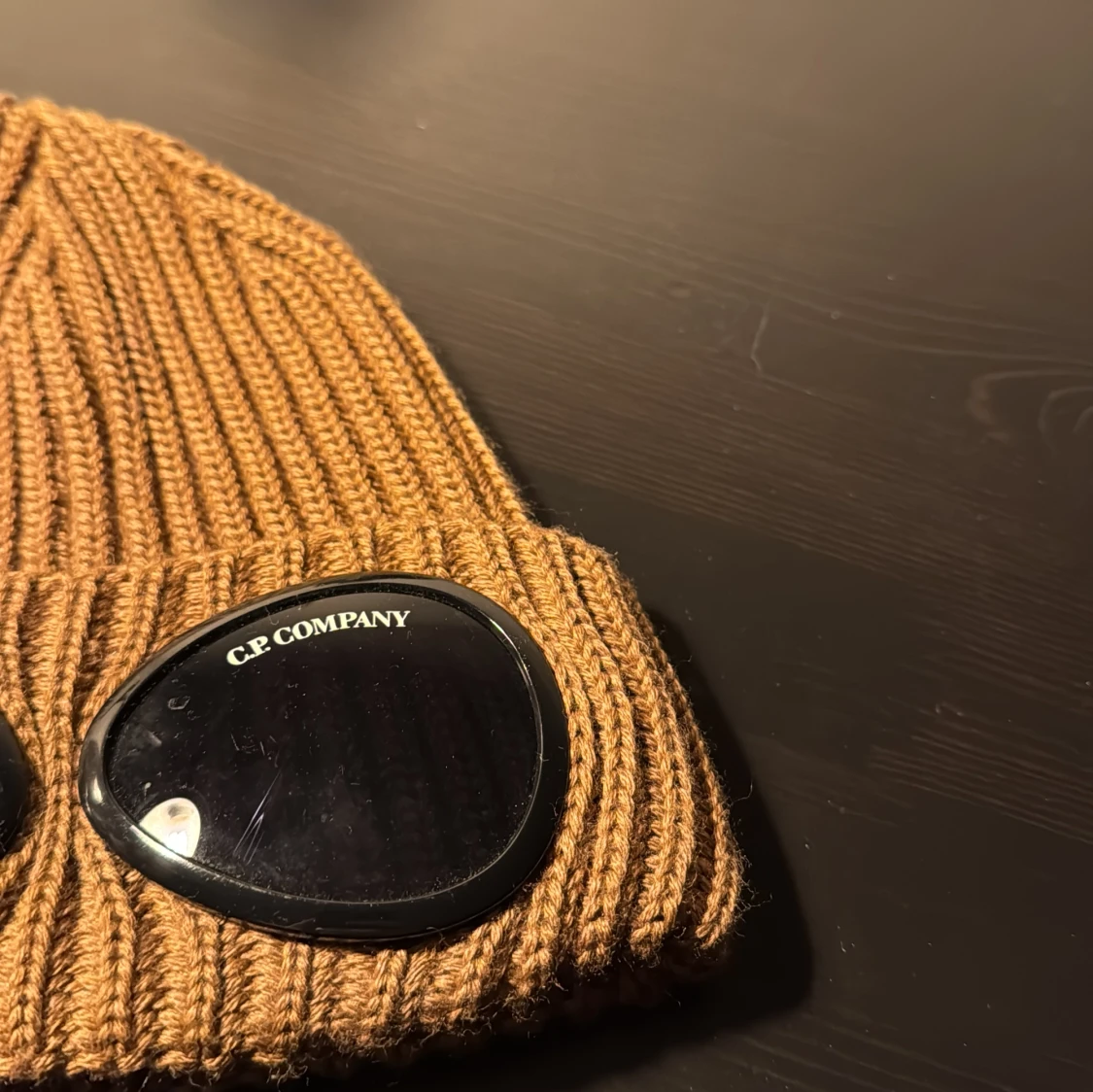 Säljer en snygg brun ribbad mössa från C.P. Company. Den har coola svarta glasögondetaljer framtill som ger en unik look. Perfekt för att hålla sig varm och stilren under höst och vinter. Passar både till vardags och lite mer avslappnade tillfällen.