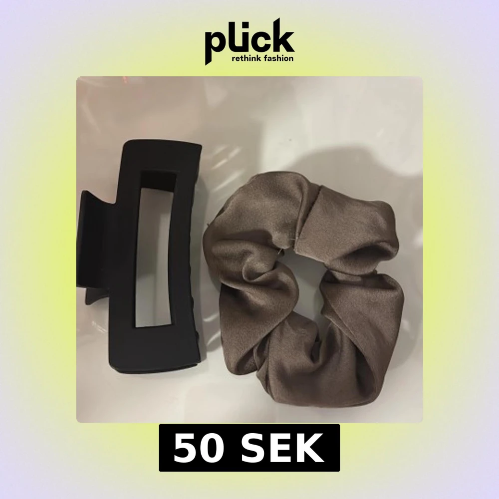 Snygg brun scrunchie i glansigt satinmaterial som ger en lyxig känsla till din frisyr och en svart hårklämma. Perfekta accessoarer för att sätta upp håret med stil och samtidigt vara skonsam mot håret.