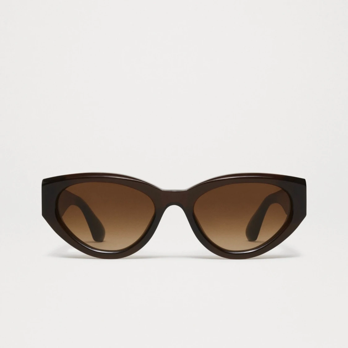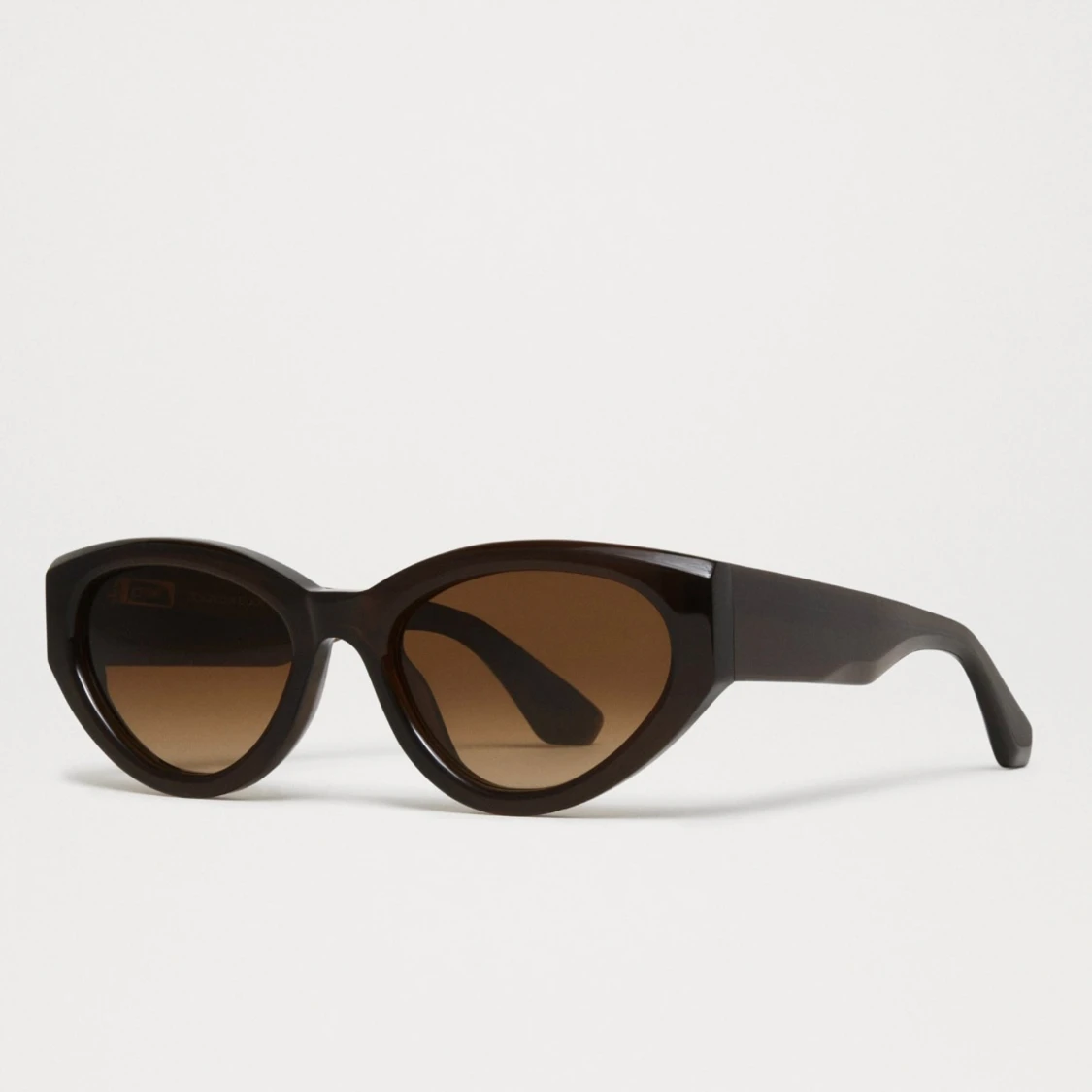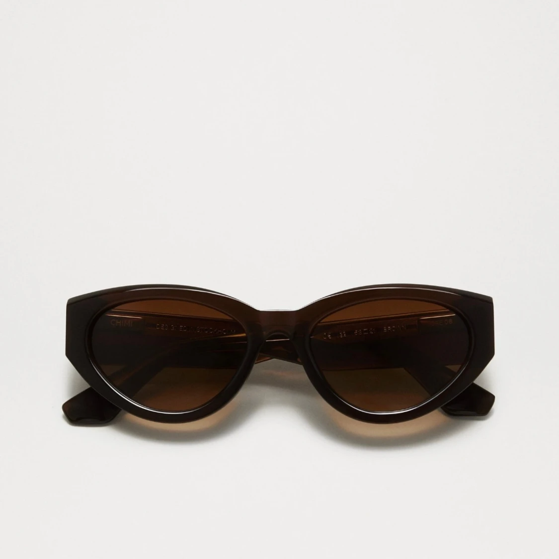 Snygga solglasögon från Chimi i en mörkbrun nyans. Glasögonen har tjocka, glansiga bågar och bruna tonade linser.