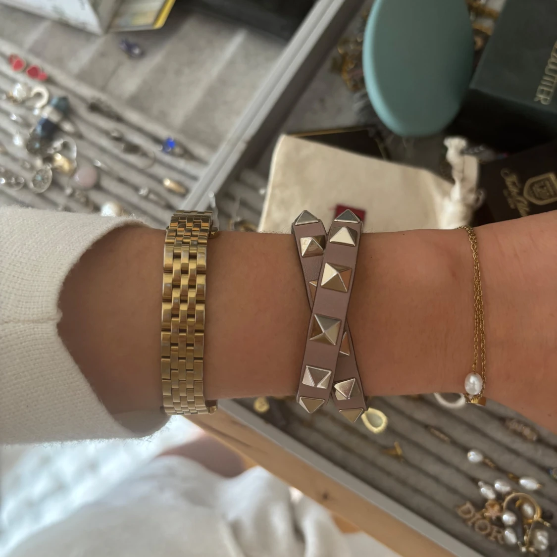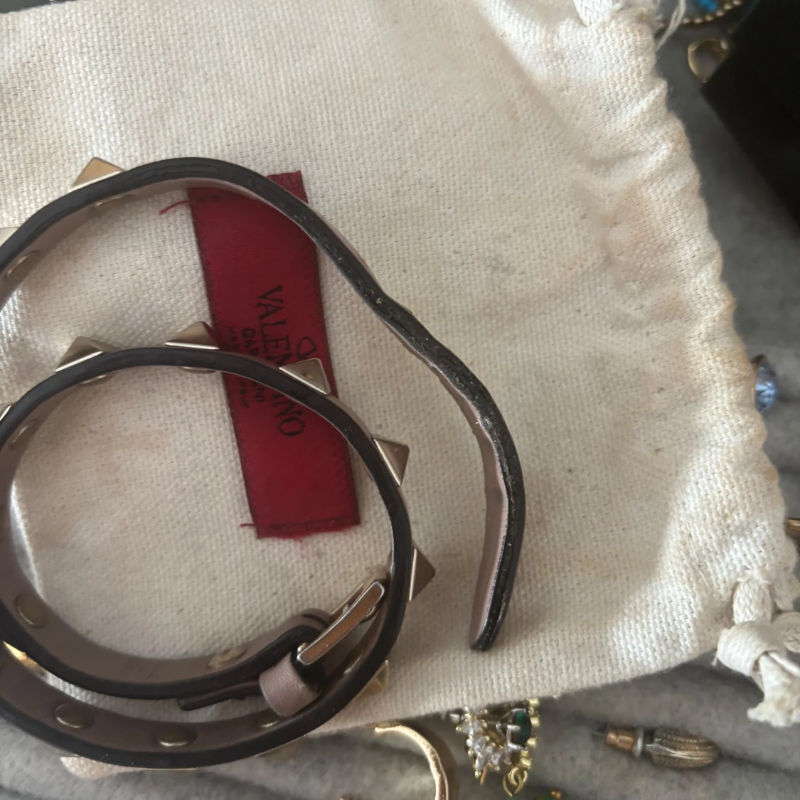 Snyggt armband från Valentino med guldiga nitar. Har blivit lagat i slutningen, inget som märks eller syns när man har det på sig. Nypris runt 3500kr säljer för 1500kr 💙
