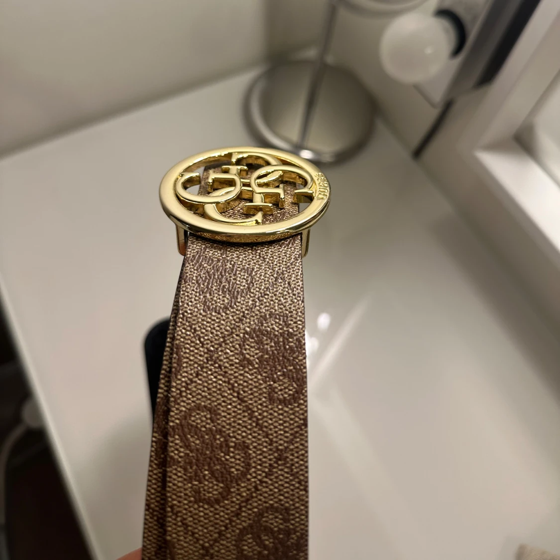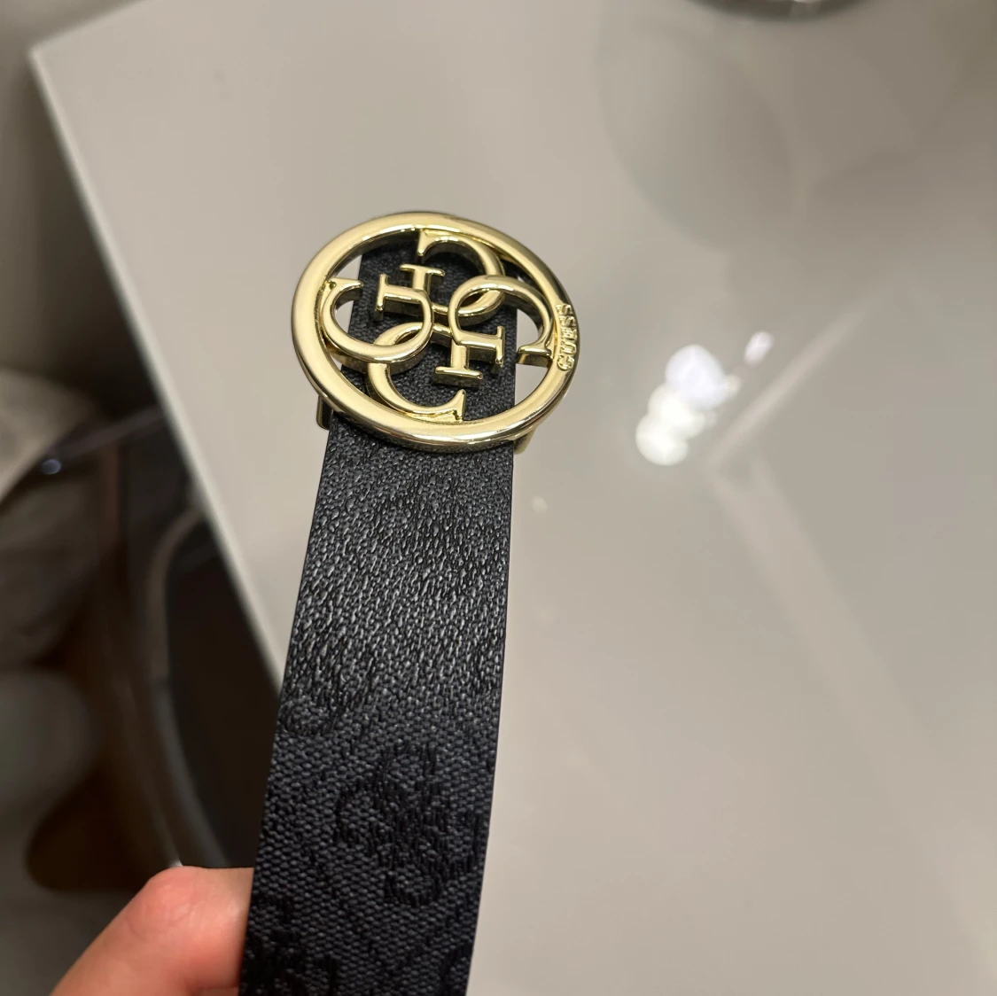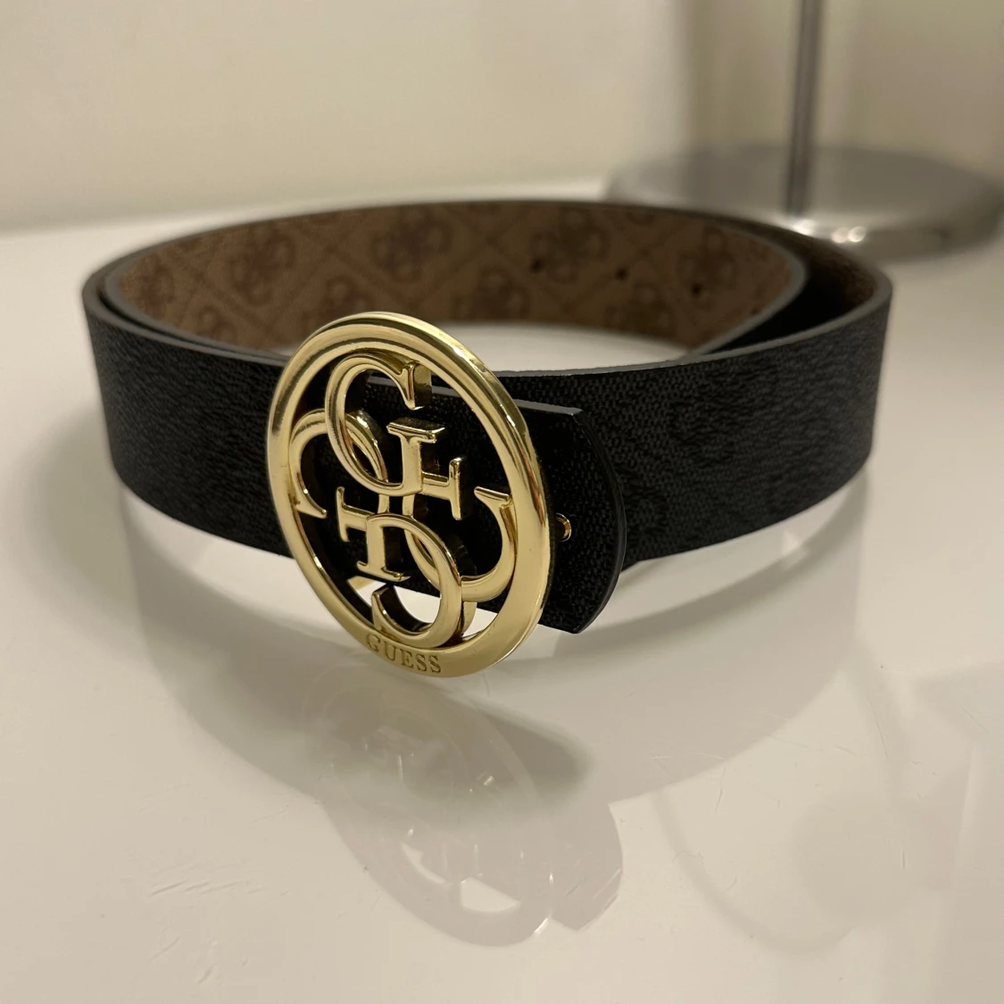 Snyggt vändbart bälte från Guess med ett elegant mönster. Ena sidan är brun med logotypmönster och den andra är svart. Bältet har ett stort, runt guldfärgat spänne med Guess-logotypen. Perfekt för att ge din outfit en lyxig touch. Oanvänd