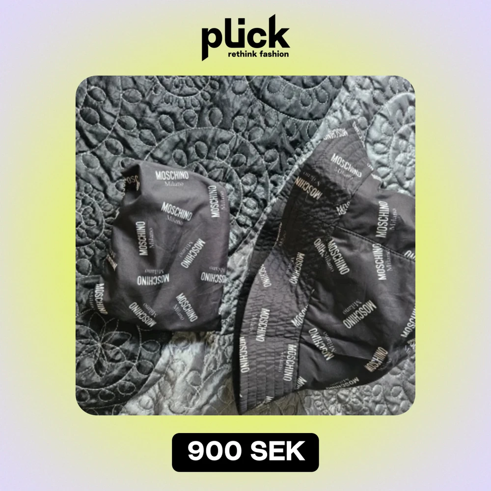 En svart hatt från Moschino med vitt tryck av varumärkets namn. Hatten är tillverkad av 100% polyester och har en bred kant. Den är designad för att vara bekväm och stilren. Som ny!