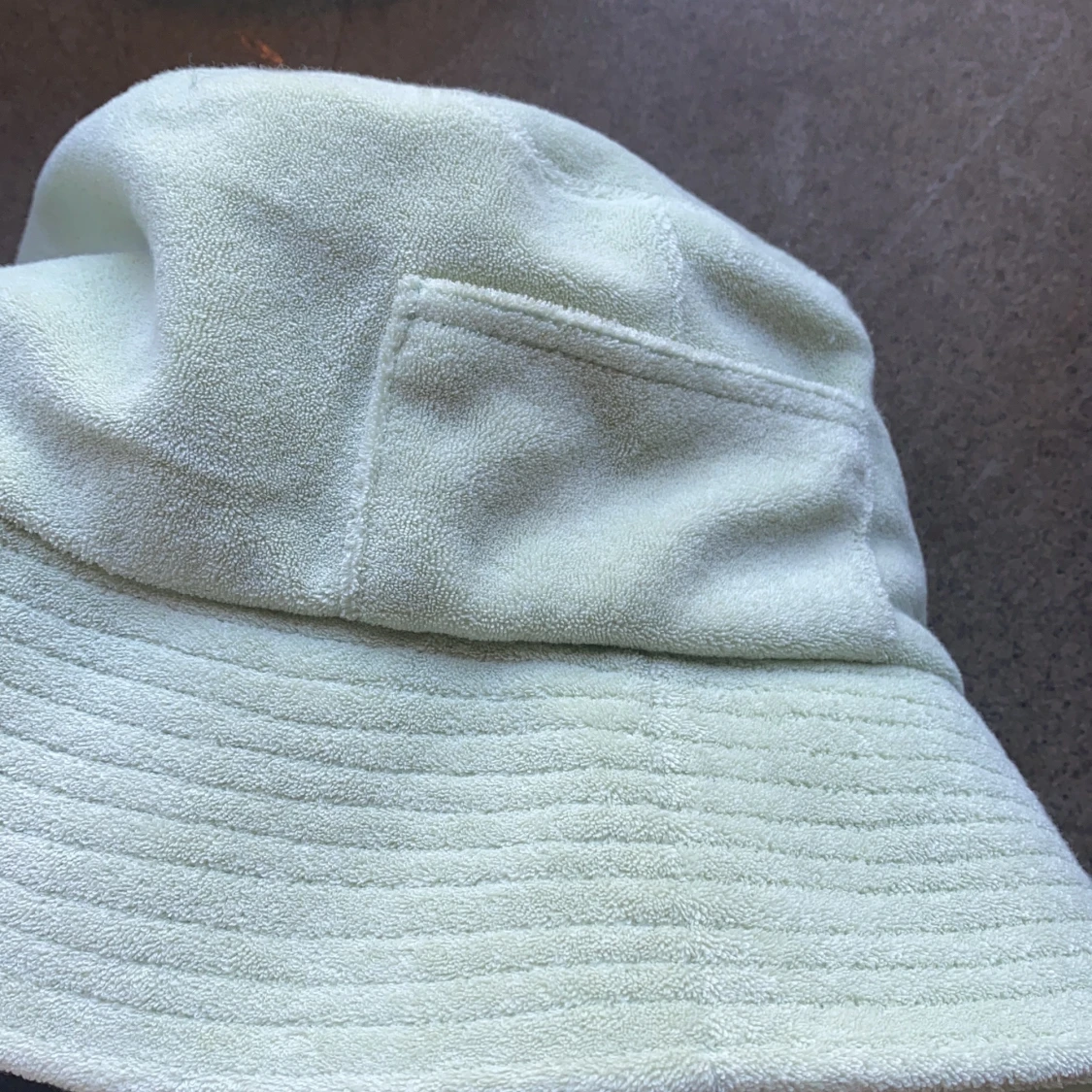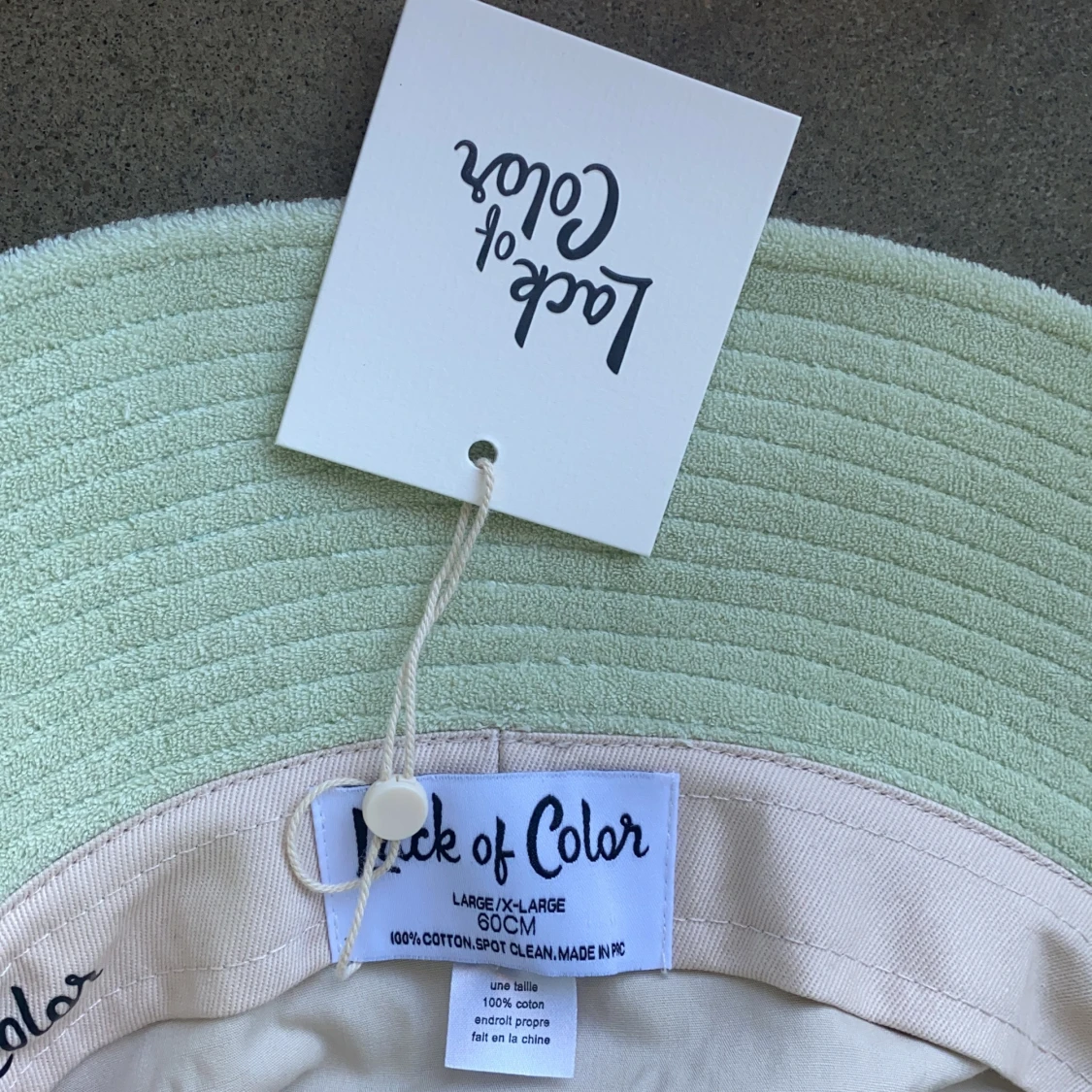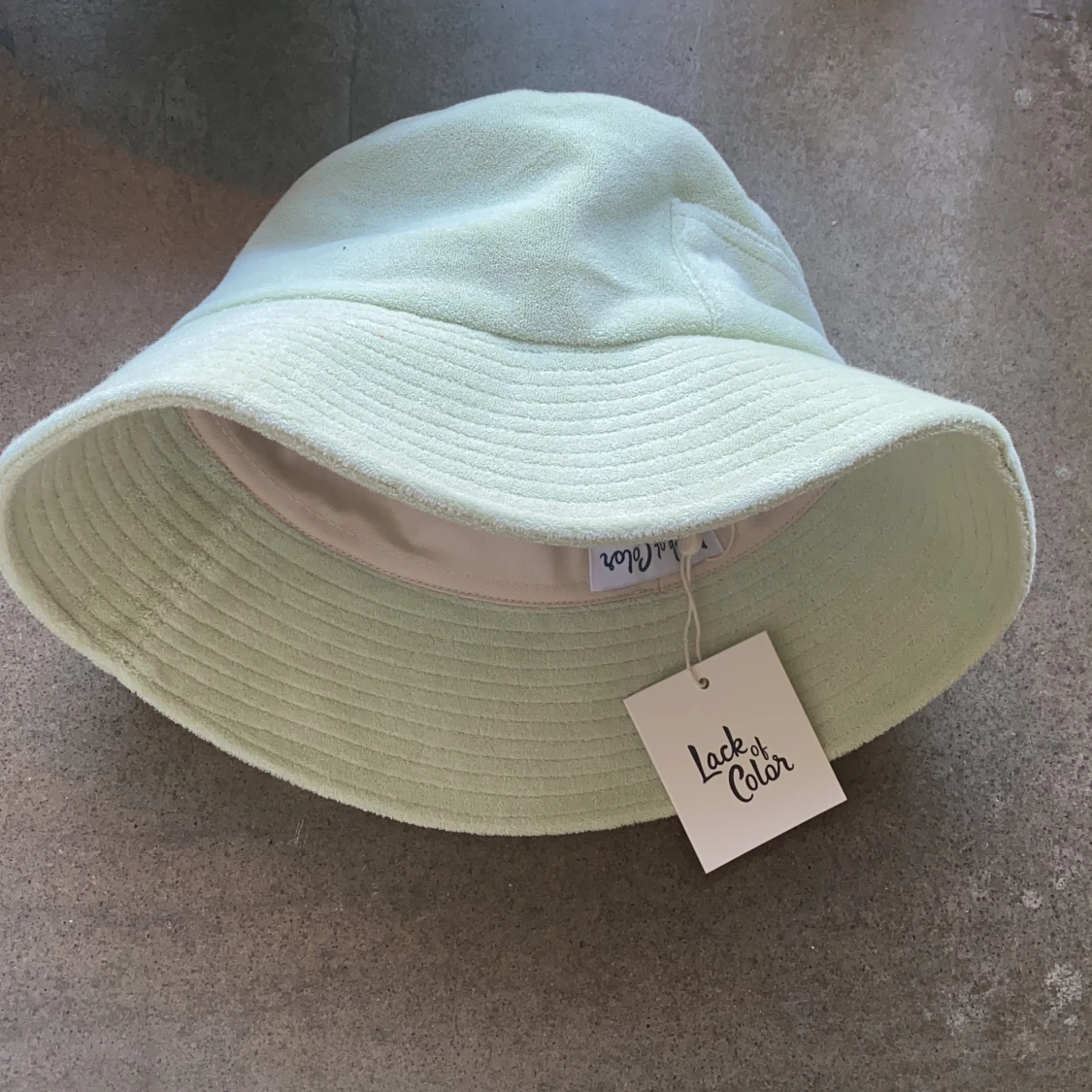 Supertrendig bucket hat i mintgrön frotté från det australiensiska märket Lack of Color. Hatten har UV skydd och en praktisk ficka. Storlek L. Helt oanvänd och kostar runt 1000kr nypris.