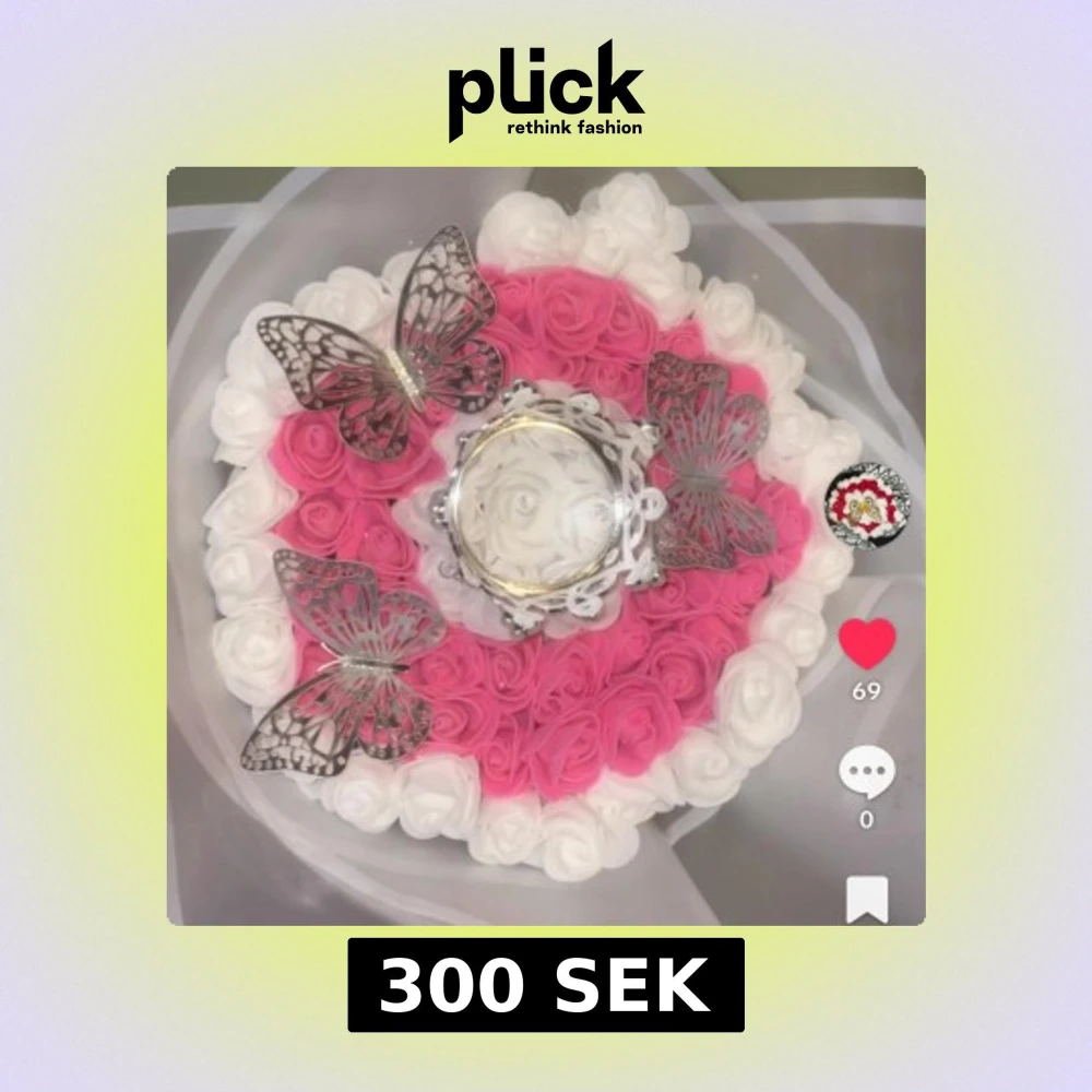 Unik silverfärgad ring med kronformad detalj och gnistrande stenar, presenterad i en bukett av vita och rosa rosor med dekorativa silvriga fjärilar. Perfekt för dig som vill sticka ut med något riktigt speciellt.