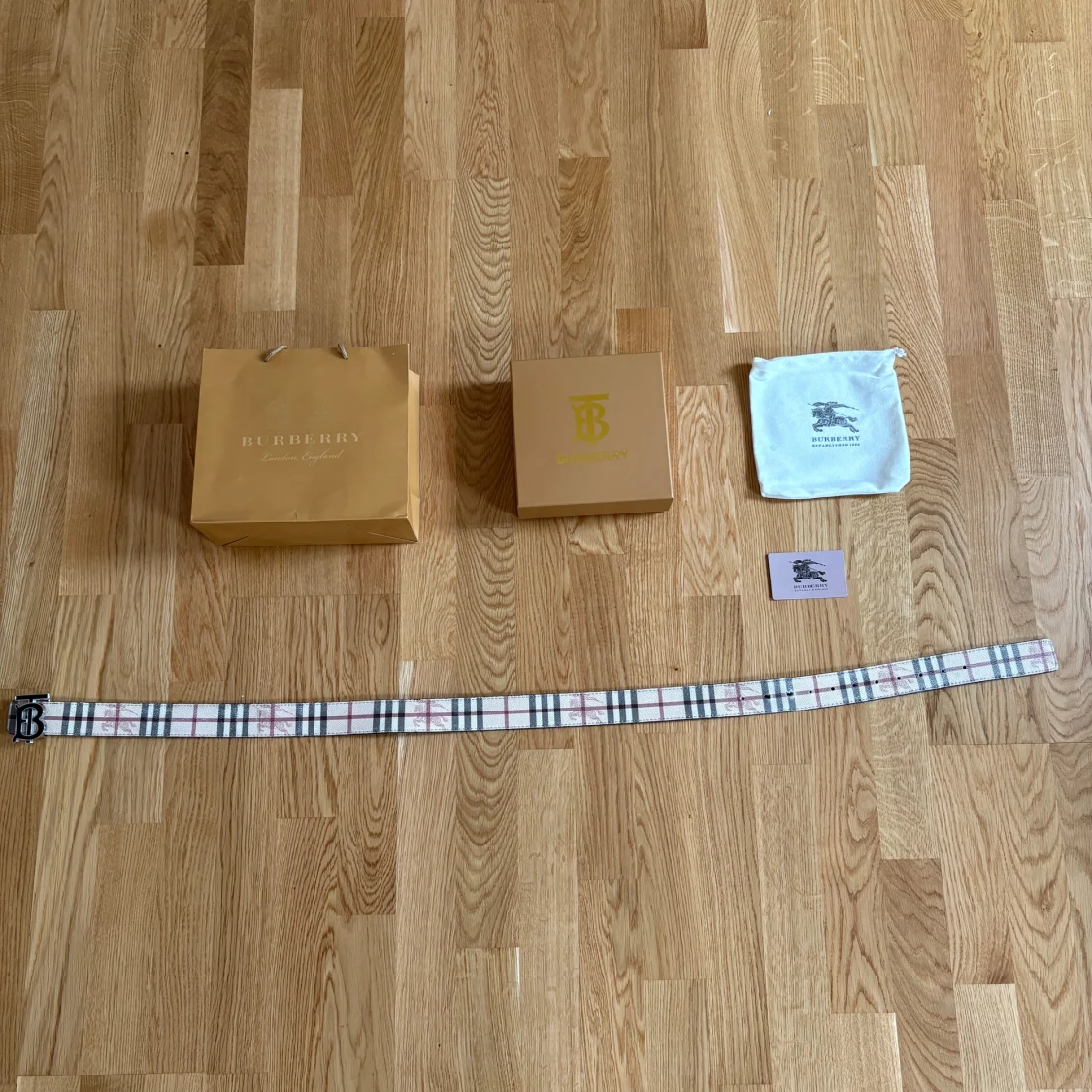 Snyggt Burberry-bälte med klassiskt rutigt mönster i beige, svart, rött och vitt. Bältet har ett stort metallspänne med Burberry B-logga. Tillverkat i skinn och levereras med originalförpackning, dustbag och äkthetskort. (Förpackning ingår inte)