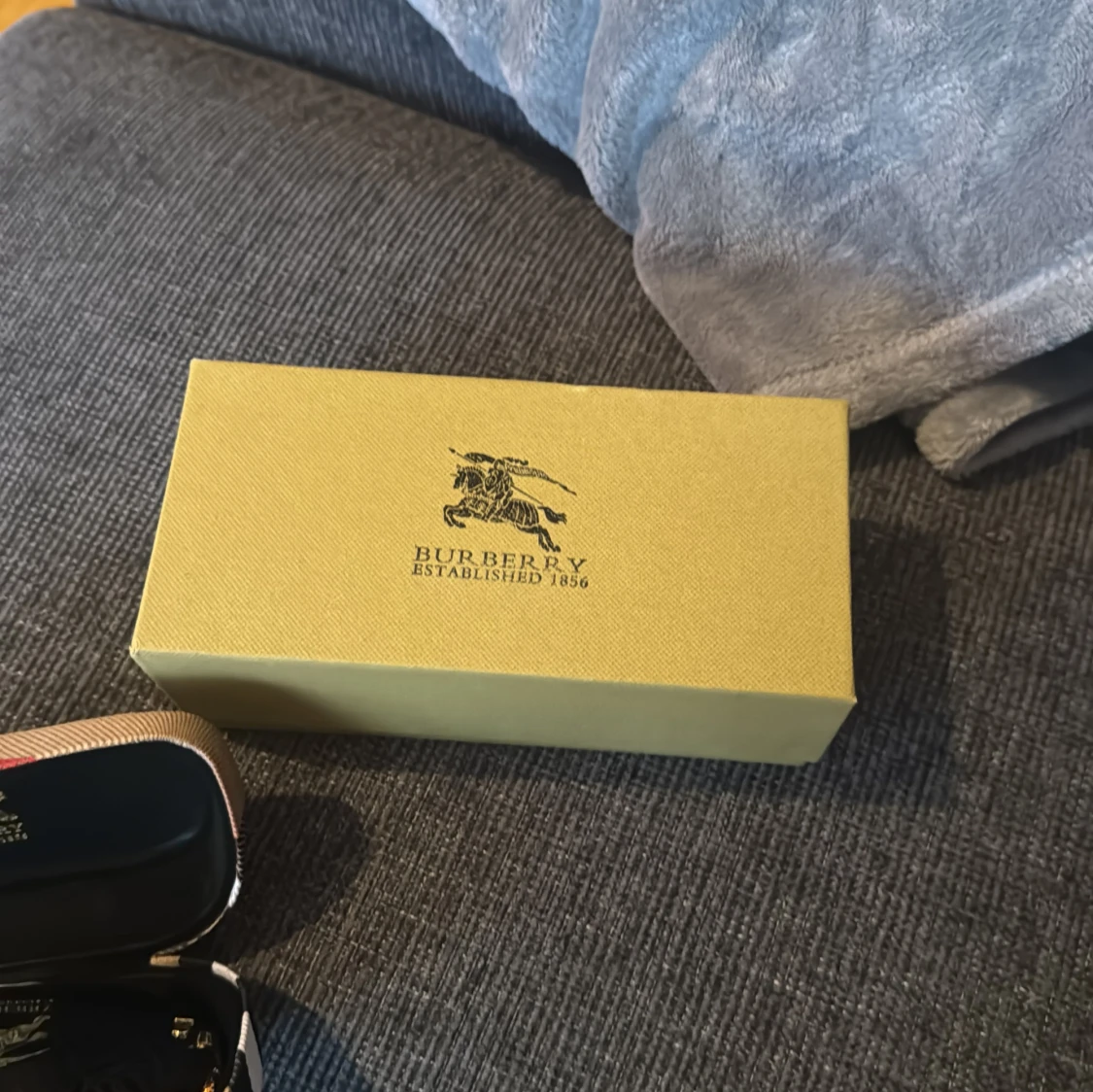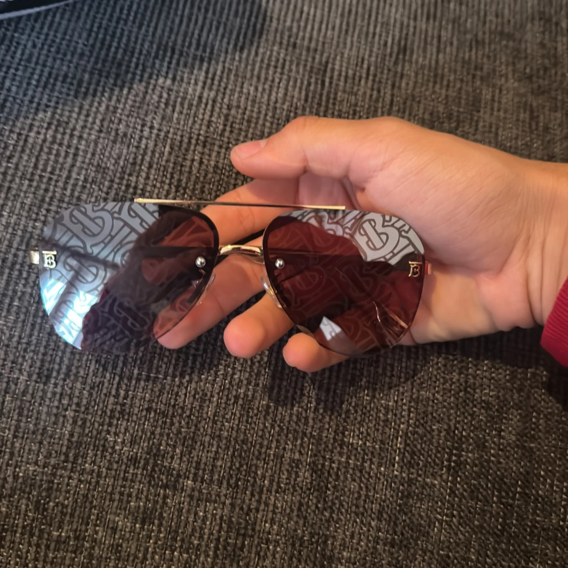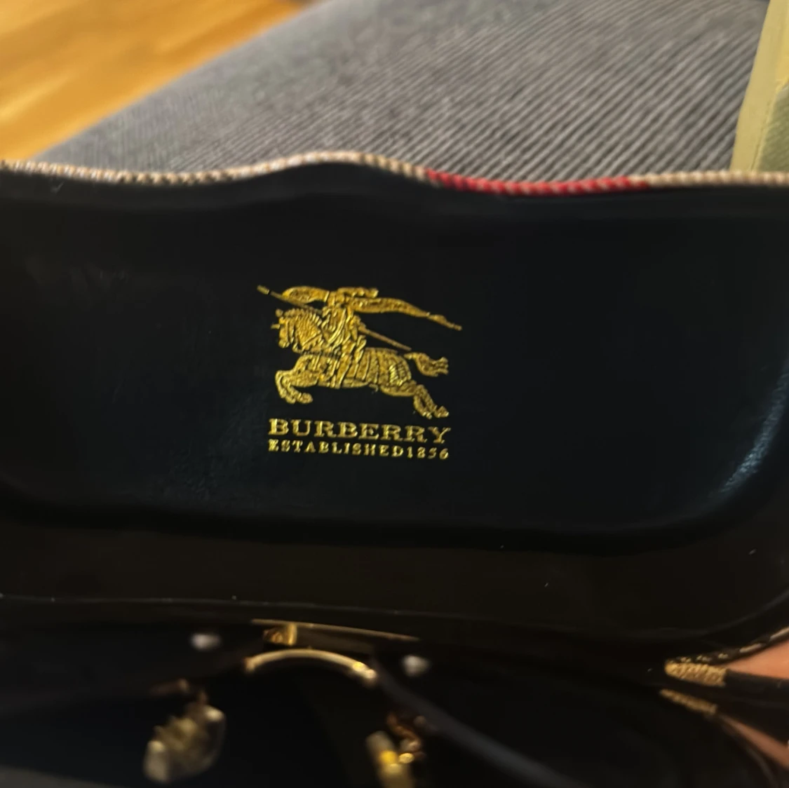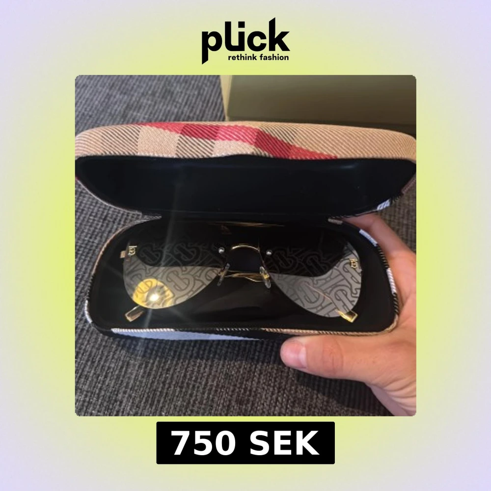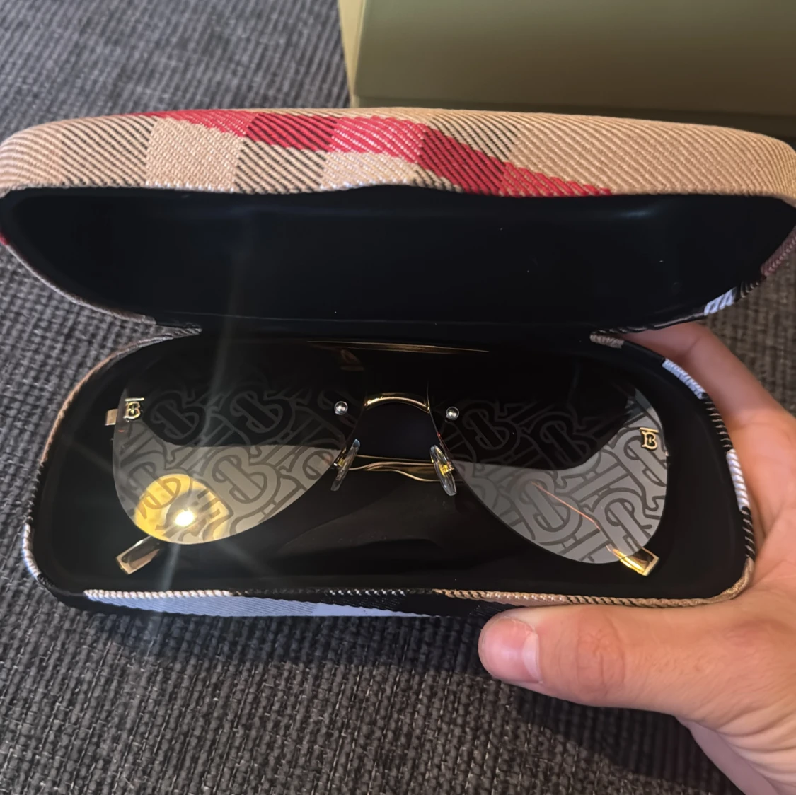 Säljer ett par snygga Burberry solglasögon med aviatorform och guldiga detaljer. Glasen är mörkbruna med Burberrys monogrammönster över hela ytan. Kommer med originaletui i klassiskt rutigt Burberry-tyg och guldfärgad box. Perfekt för dig som vill sticka ut med lyxig stil.