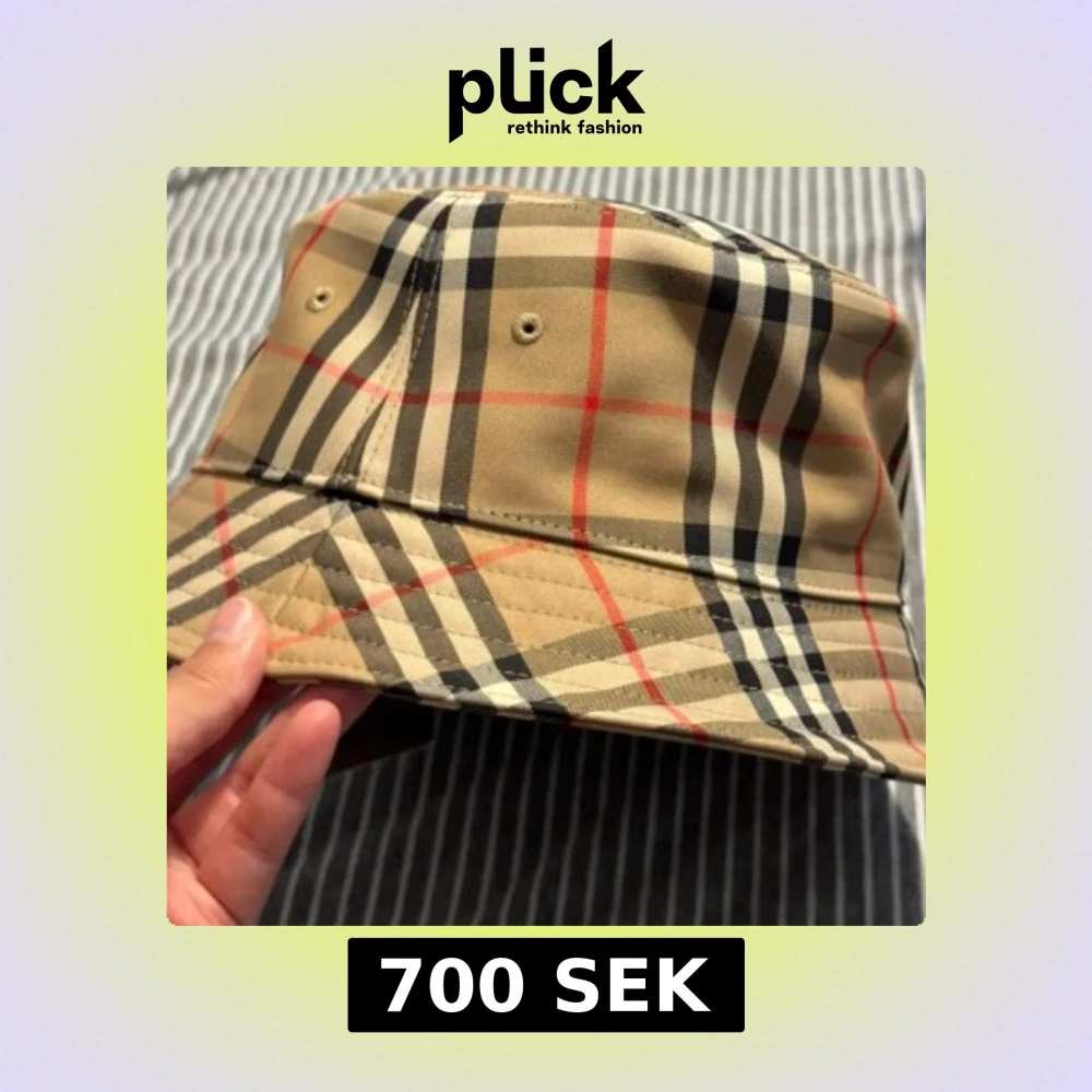 Snygg bucket hat från Burberry i deras ikoniska beigea rutiga mönster med svarta, vita och röda detaljer. Hatten är tillverkad i en mix av bomull och polyester och har klassisk form med sydda sömmar och metallöljetter på sidorna.