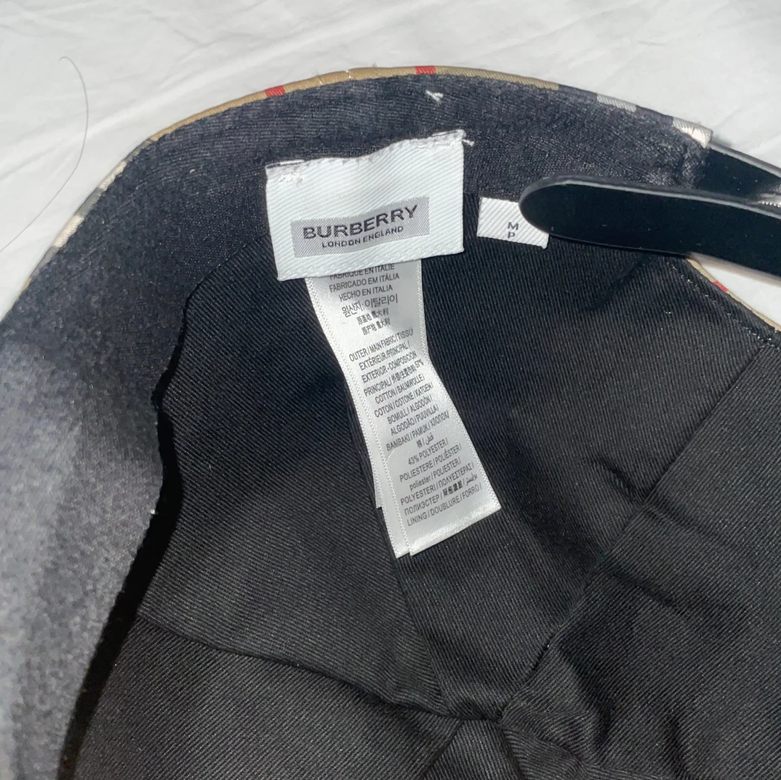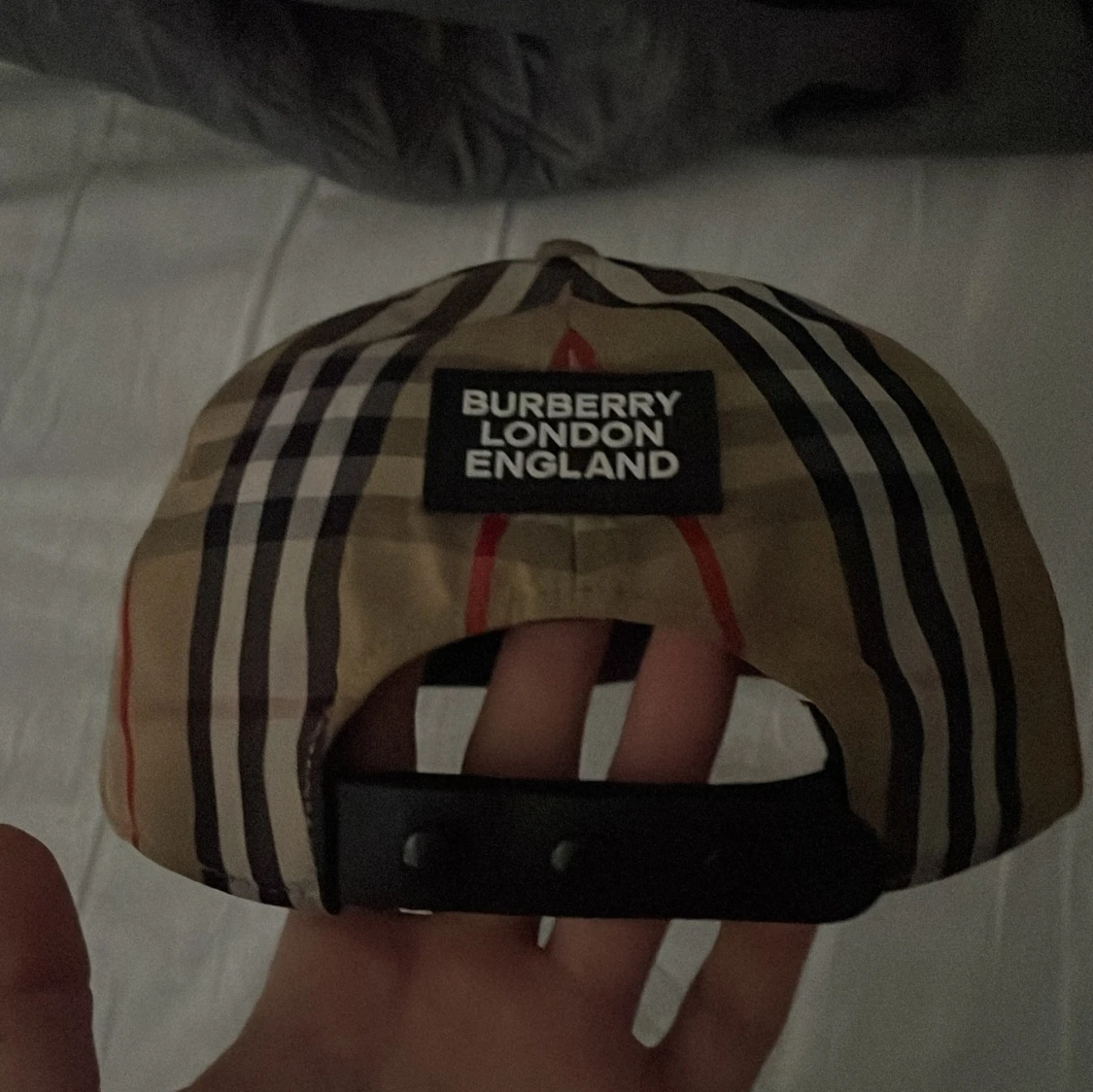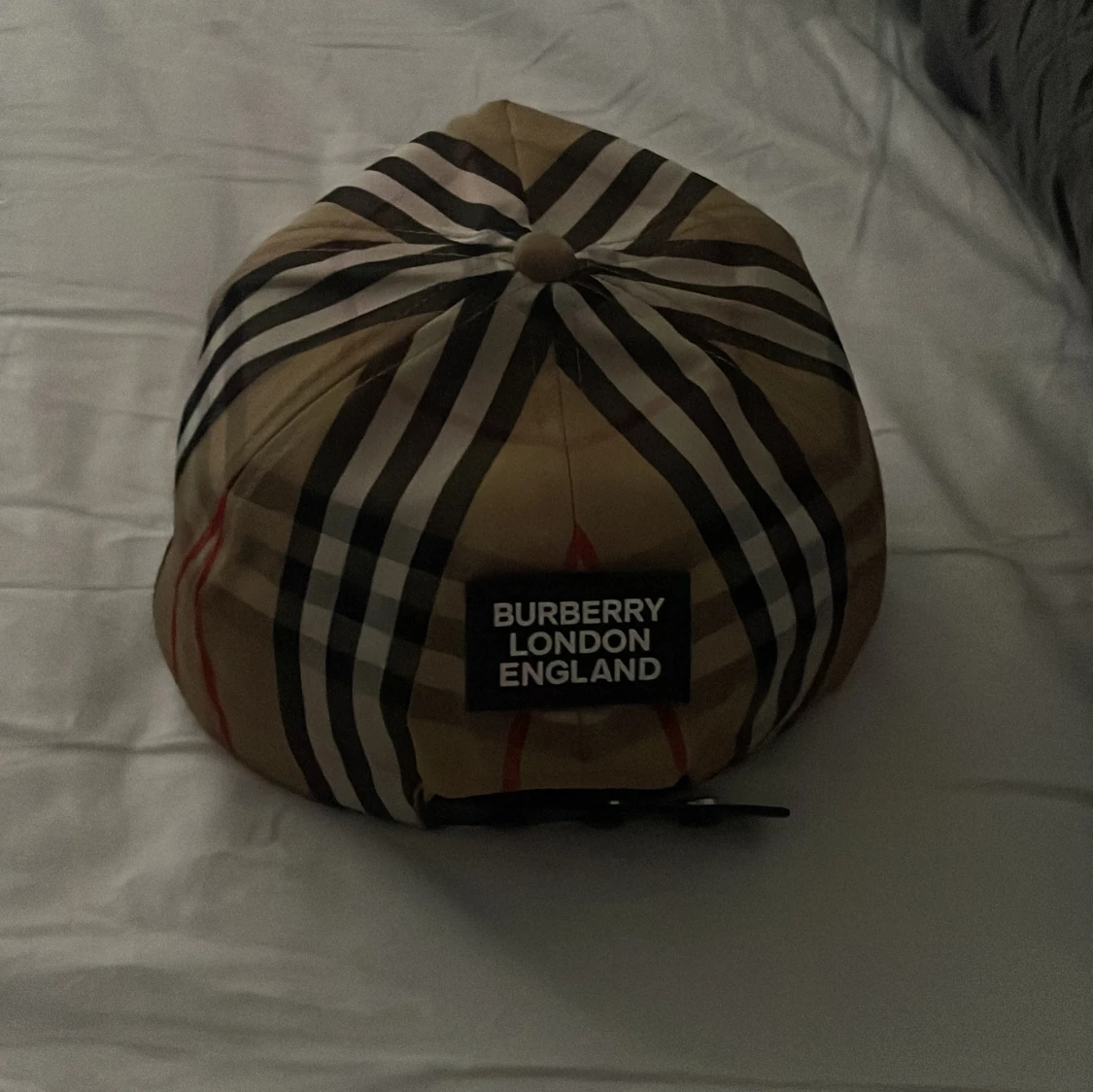 Snygg keps från Burberry med klassiskt rutigt mönster i beige, svart, vitt och röda detaljer. Märket syns tydligt baktill med texten 'Burberry London England'. Kepsen är tillverkad i bomull och polyester och har justerbar rem baktill för perfekt passform.