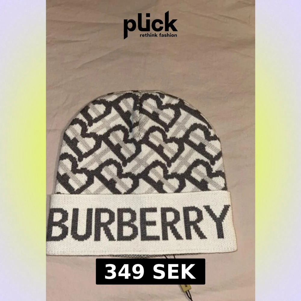 Snygg vit och grå mössa från Burberry med stor logga framtill och grafiskt mönster över hela mössan. Stickad i mjukt material som håller dig varm och ger en lyxig vibe. Perfekt för dig som vill sticka ut med designeraccessoar.