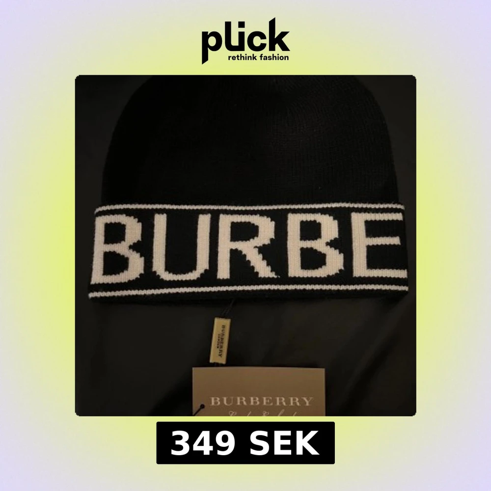 Snygg svart mössa från Burberry med stor vit logotyp runt hela kanten. Mössan är stickad och har en klassisk, rund form som passar perfekt för kalla dagar. Materialet är mjukt och håller dig varm samtidigt som du får en stilren look.