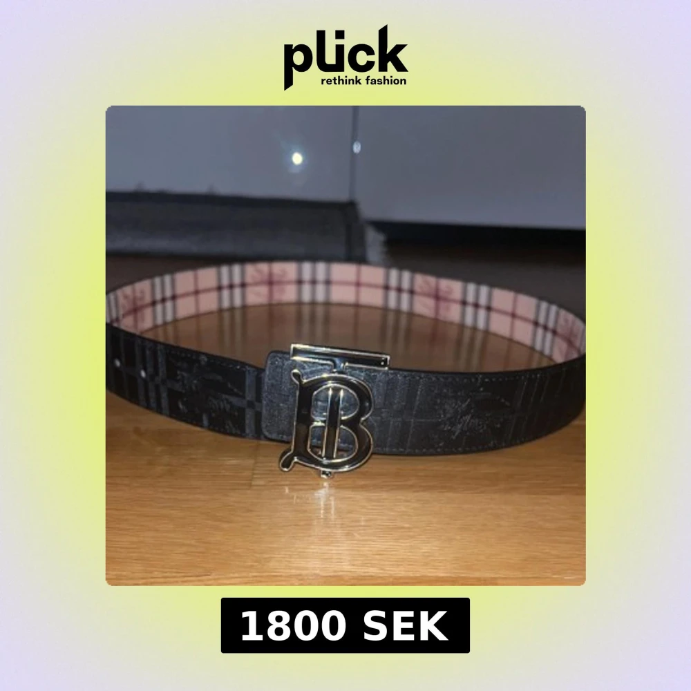 Snyggt svart skärp från Burberry med klassiskt rutigt mönster på insidan och ett stort metallfärgat B-spänne framtill. Skärpet är gjort av skinn.