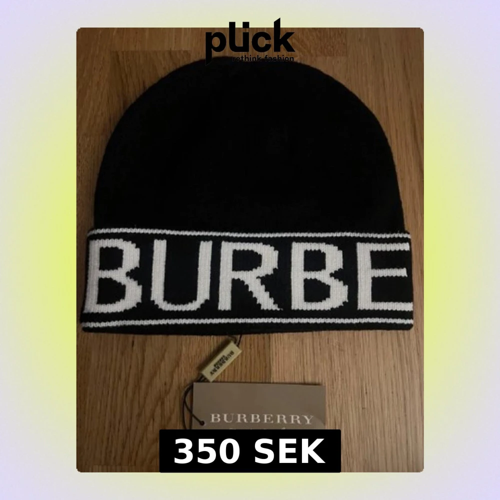 Svart mössa från Burberry med bred vit kant där BURBERRY är stickat i stora bokstäver. Klassisk och stilren design som passar perfekt för kalla dagar. Materialet är stickat och känns mjukt mot huvudet.