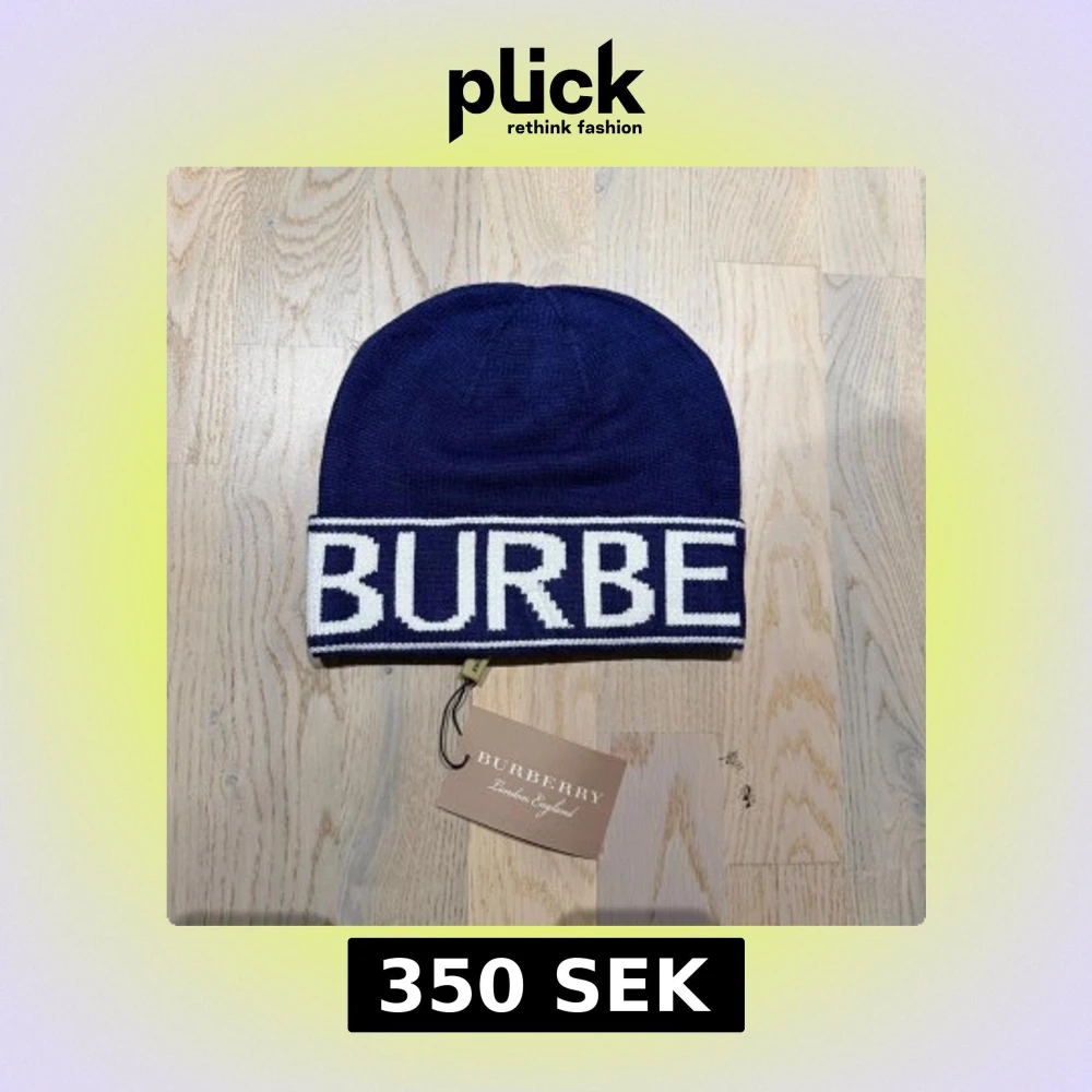 Snygg mörkblå mössa från Burberry med stor vit logotyp runt kanten. Klassisk och stilren design som ger en lyxig vibe. Stickad i mjukt material som sitter skönt på huvudet. Perfekt för dig som vill ha något trendigt och exklusivt.