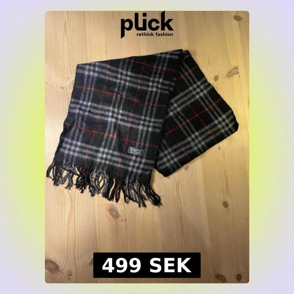 Snygg svart halsduk från Burberry med klassiskt rutigt mönster i grått och rött. Halsduken är gjord i mjuk ull och har fransar längs nederkanten. Perfekt för dig som gillar tidlös design och vill ha något som sticker ut lite extra.