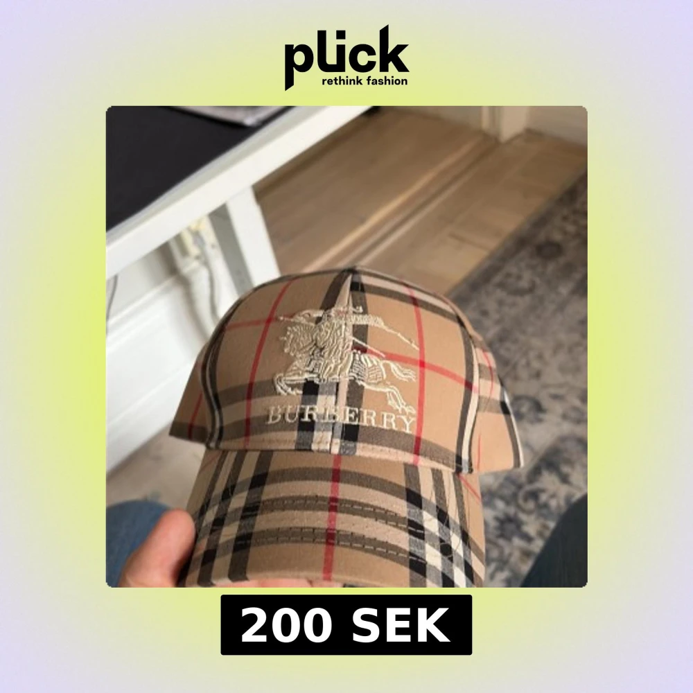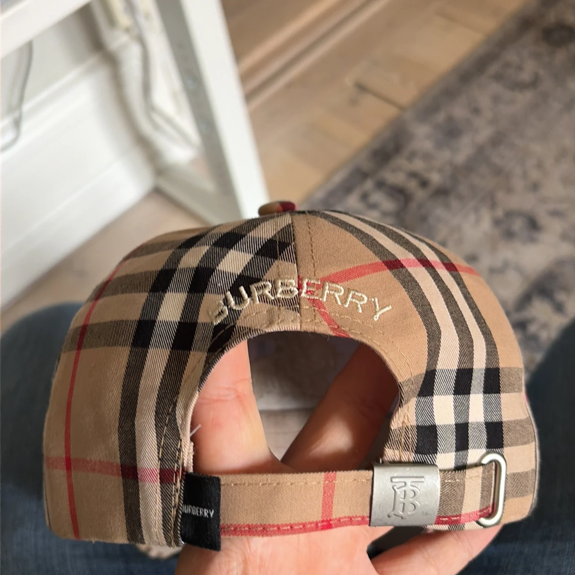 Snygg keps från Burberry i klassiskt beige rutigt mönster med svarta och röda detaljer. Framtill finns ett broderat Burberry-emblem och logga, samt justerbart spänne med metall-detalj bak. Materialet är bomull och insidan har Burberry-band.