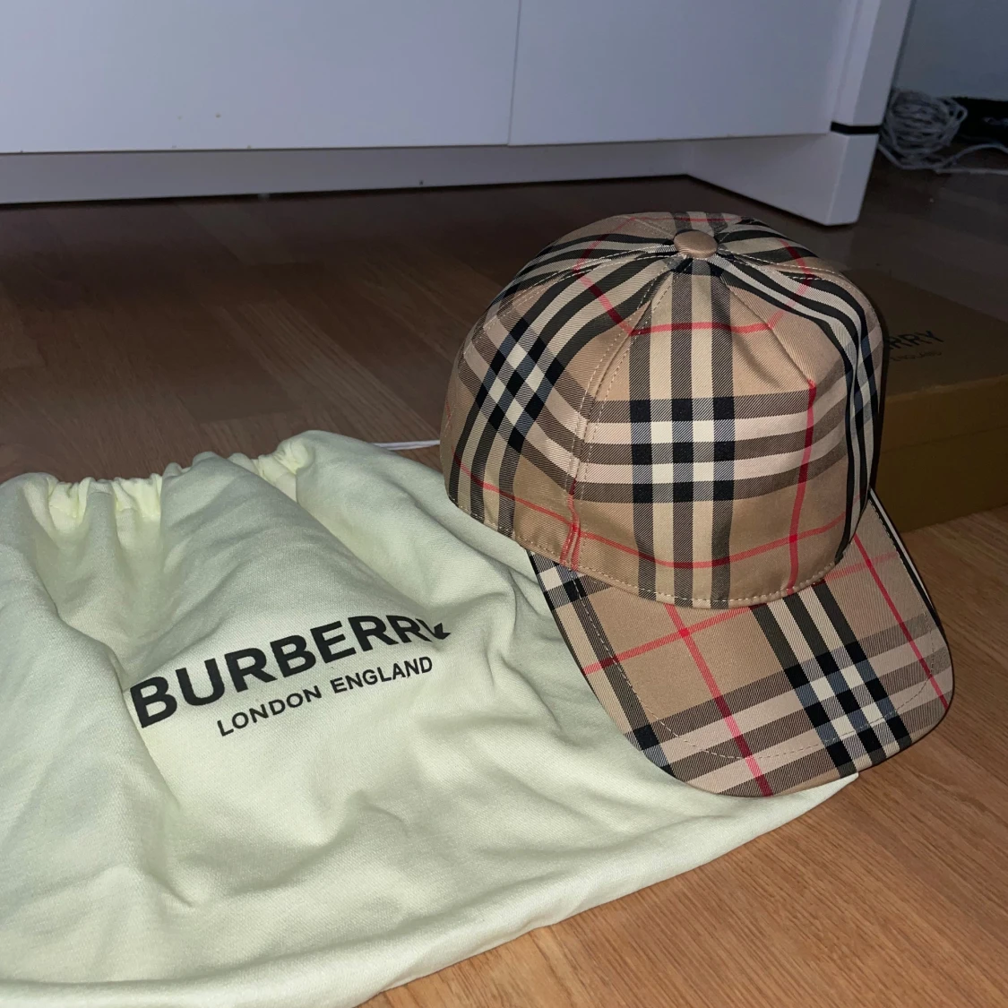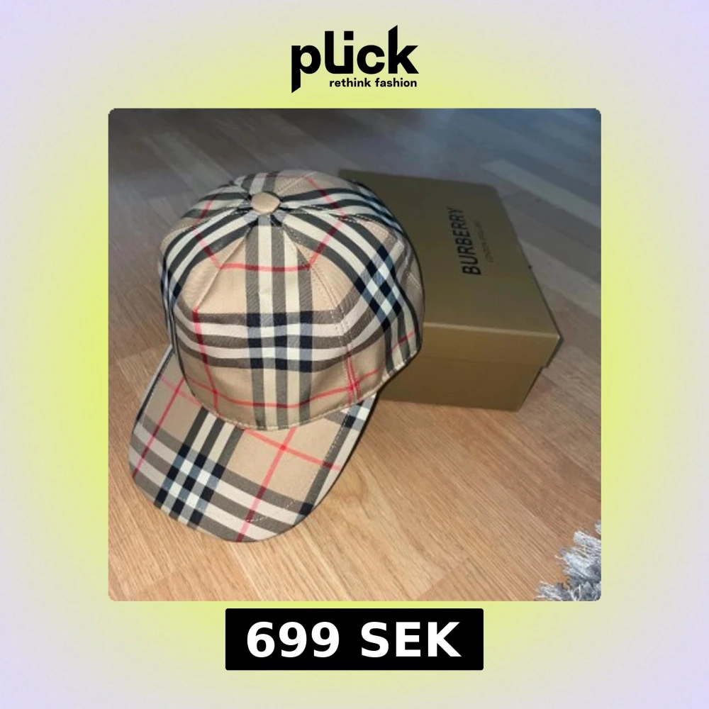 Säljer en klassisk Burberry keps i beige med det ikoniska rutiga mönstret i svart, vitt och rött. Kepsen har justerbar snapback baktill och är tillverkad i bomull. Perfekt accessoar för en trendig look.