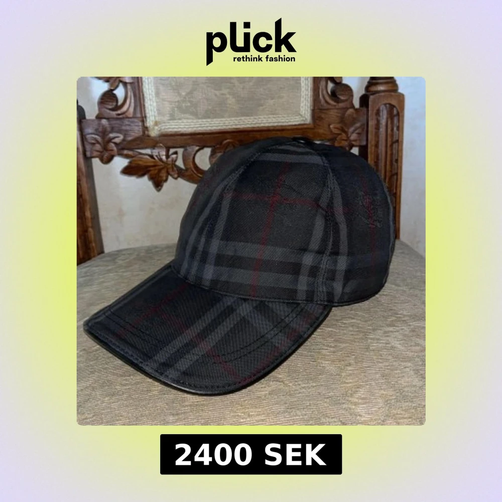 Snygg svart keps från Burberry med klassiskt rutigt mönster i grått och rött. Justerbar rem baktill med Burberry-logga. Perfekt accessoar för en stilren look.