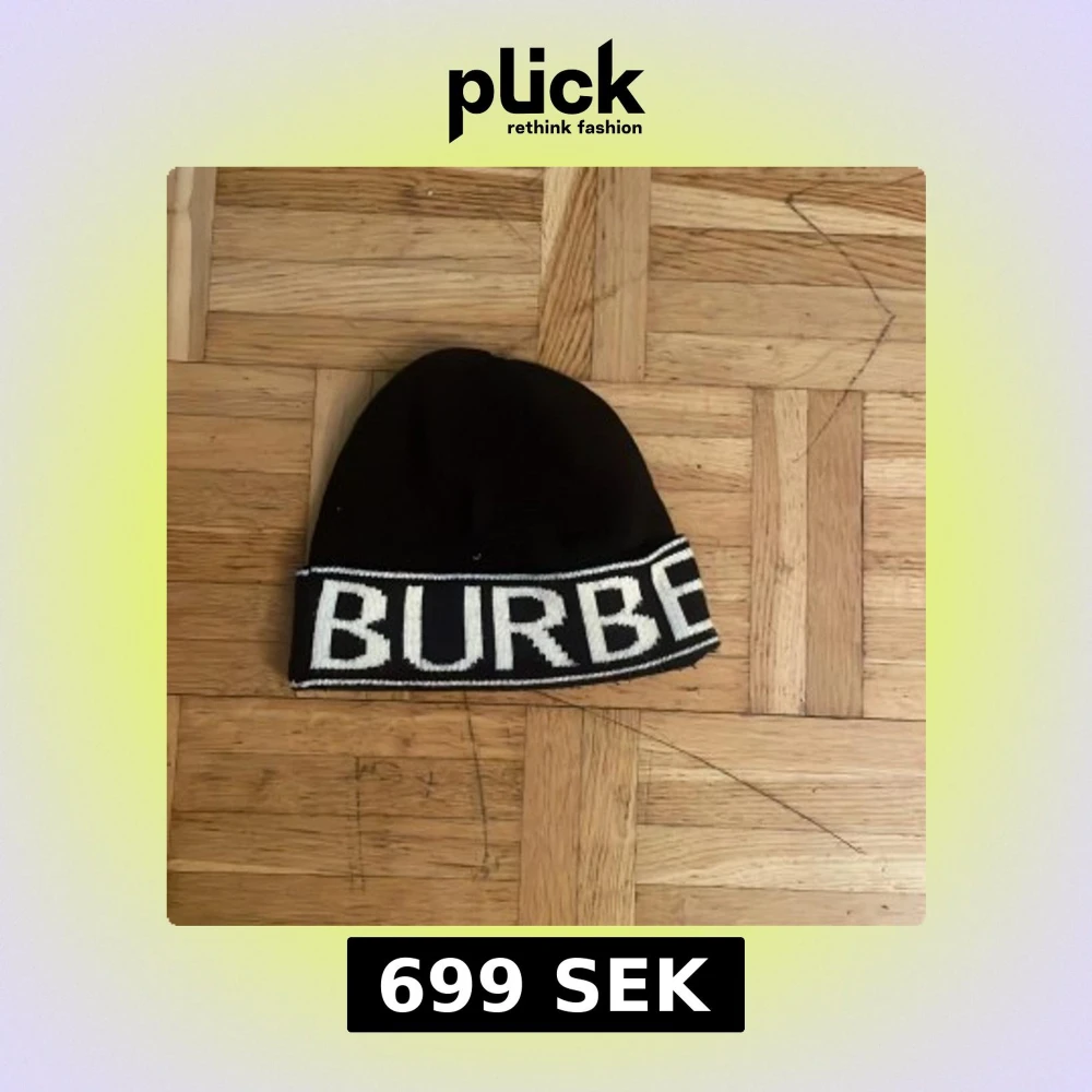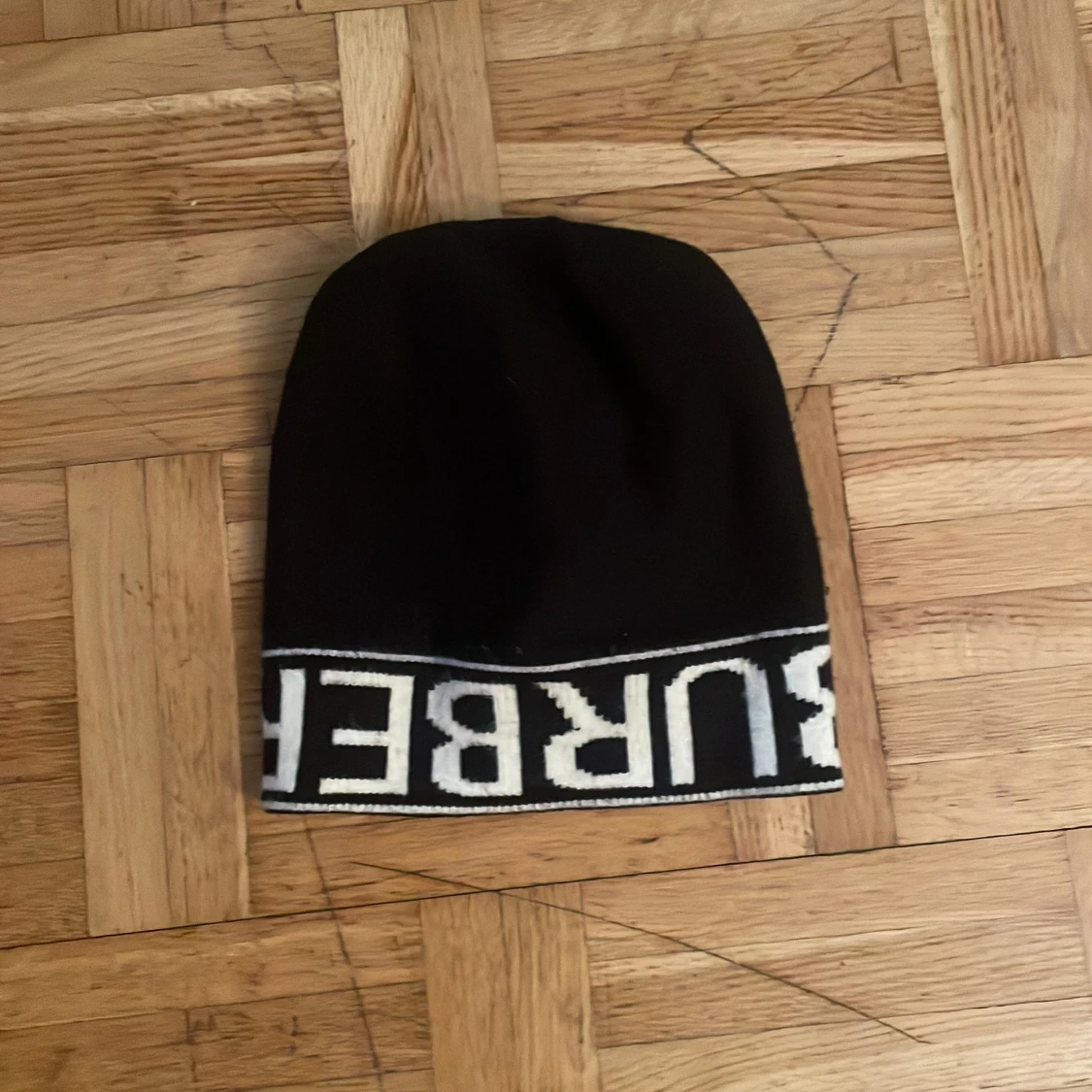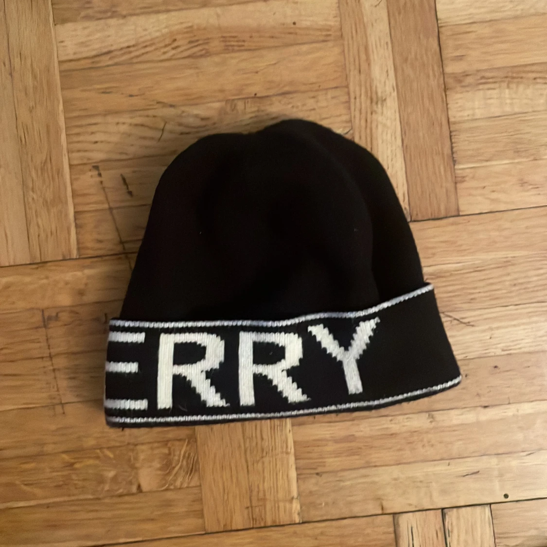 Säljer en svart mössa från Burberry med vit logotyp runt hela kanten. Klassisk och stilren design, perfekt för dig som vill ha något snyggt och enkelt. Mössan är stickad och har en mjuk känsla.