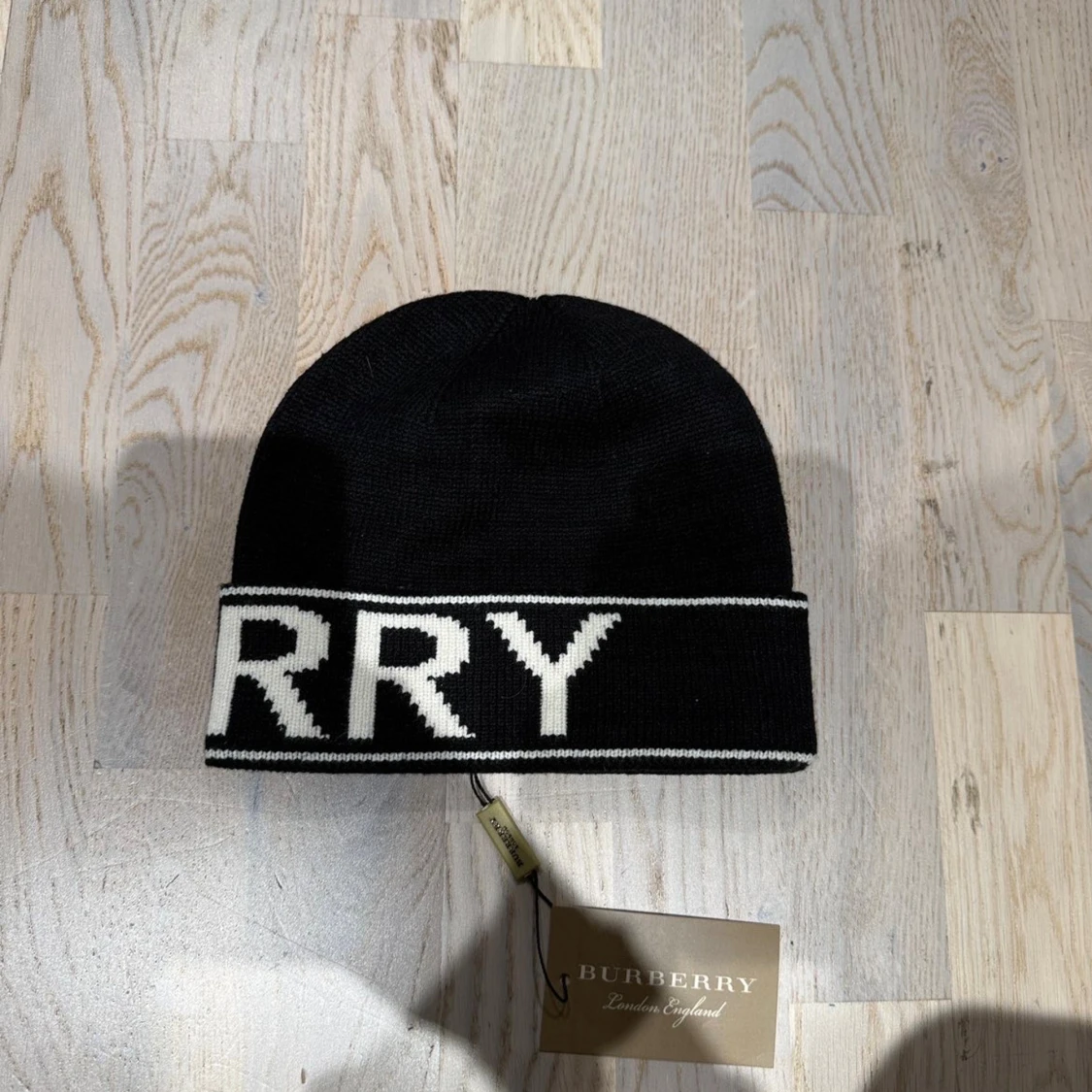 Svart mössa från Burberry med vit, bred kant där loggan är stickad runtom. Klassisk, enkel design i mjukt stickat material som känns lyxigt och passar perfekt till kalla dagar. Mössan har en tight passform och tydlig märkning både på utsidan och insidan.