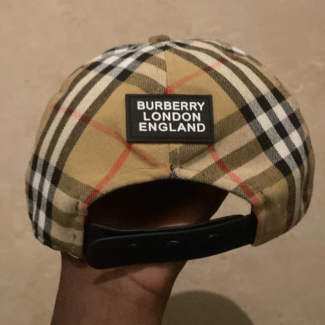 Snygg keps från Burberry med klassiskt rutigt mönster i beige, svart, vitt och rött. Justerbar baktill med svart spänne och tydlig Burberry London England-logga. Tillverkad i bomull och perfekt för dig som vill sticka ut med en ikonisk accessoar.