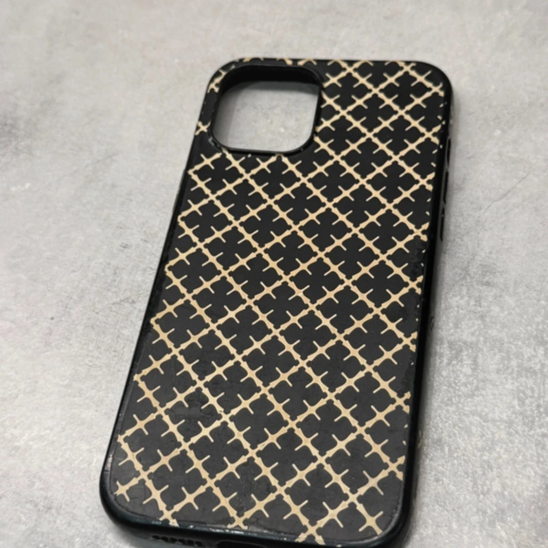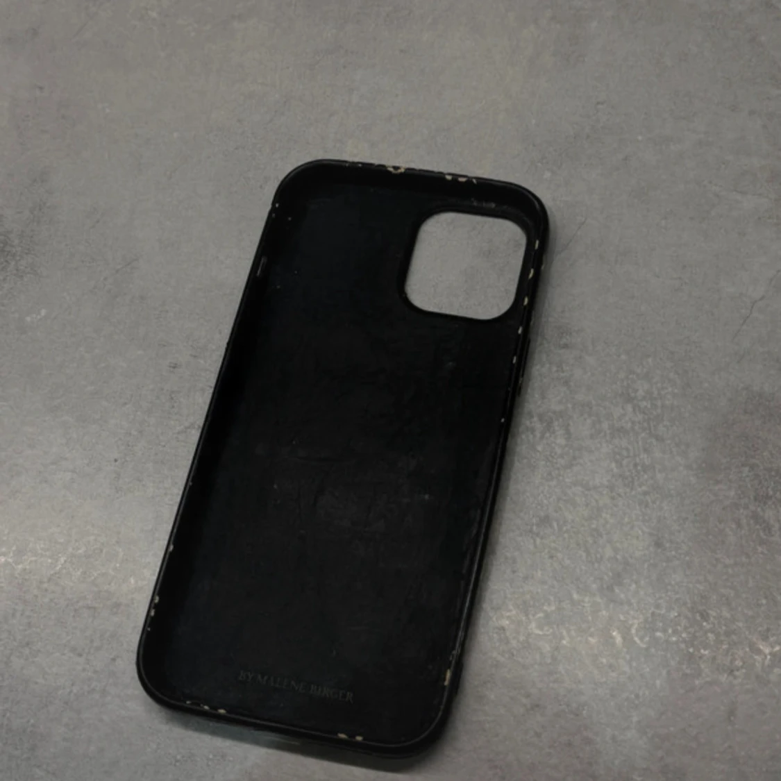 Stilrent iPhone-skal från By Malene Birger med svart och beige mönster. Passar modeller med större kameramodul. Skalet visar tecken på slitage runt kanterna men är i fullt fungerande skick och skyddar din mobil effektivt. iPhone 12 Pro Max