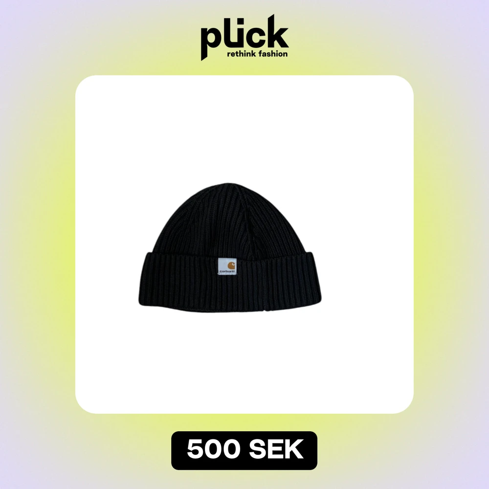 Säljer en snygg svart ribbad mössa från Carhartt. Perfekt för kalla dagar med sin stickade design och klassiska stil. Den har en uppvikt kant med Carhartt-loggan framtill. Passar både till vardags och utomhusaktiviteter. Håll dig varm och trendig i vinter!