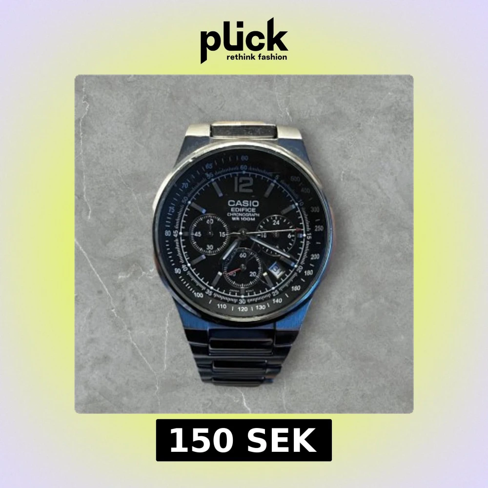 Snygg Casio Edifice klocka med svart urtavla och silverdetaljer. Den har en kronograf och är vattentät upp till 100 meter. Armbandet är i metall och matchar den stilrena designen perfekt men dock i dåligt skick då den är repad. först till kvarn🏁🏎️