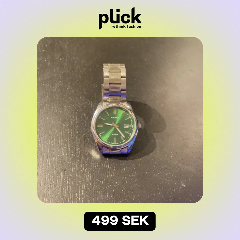Säljer en snygg Casio herrklocka i mycket bra skick. Den har en grön urtavla med silverdetaljer och datumvisning. Armbandet är i rostfritt stål och ger en stilren look. Perfekt för både vardag och fest! Storleken är oklar. Om du har stor handleder så tänk över innan köp. Klockan har några repor osv men inget märkbart på håll