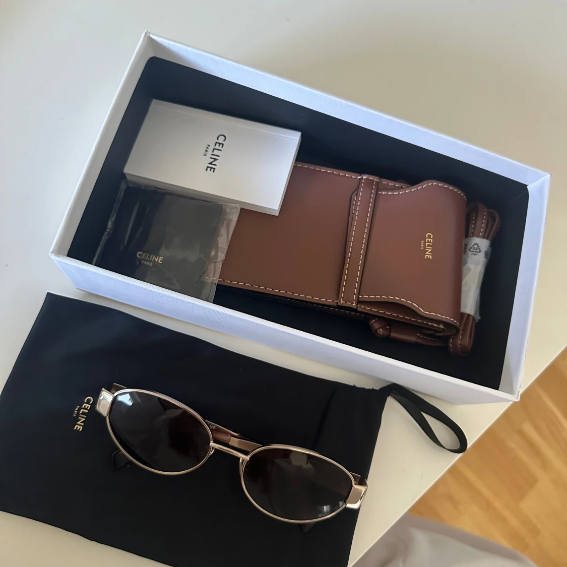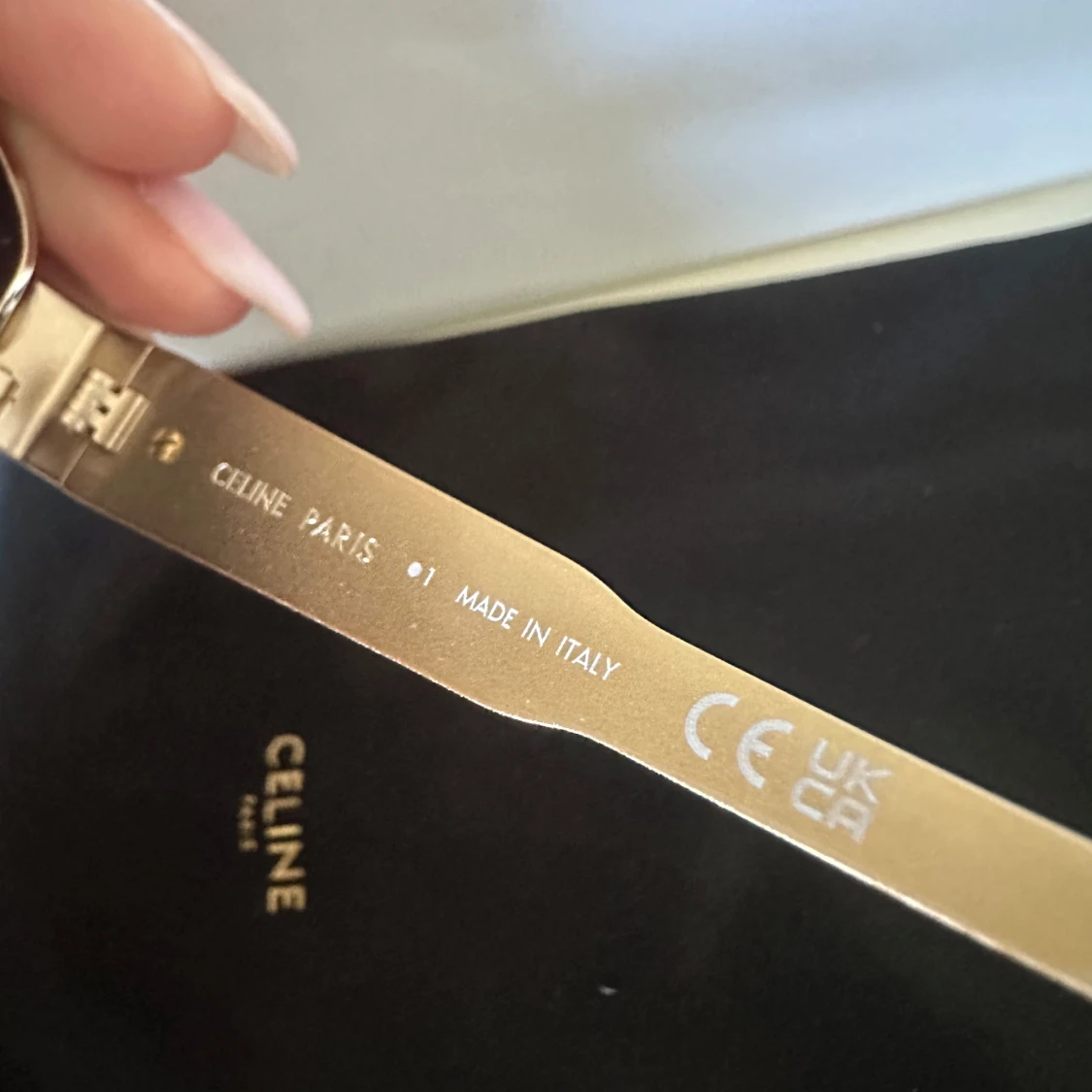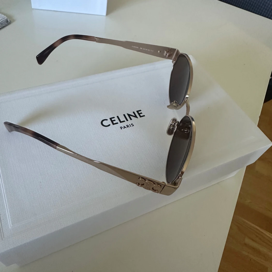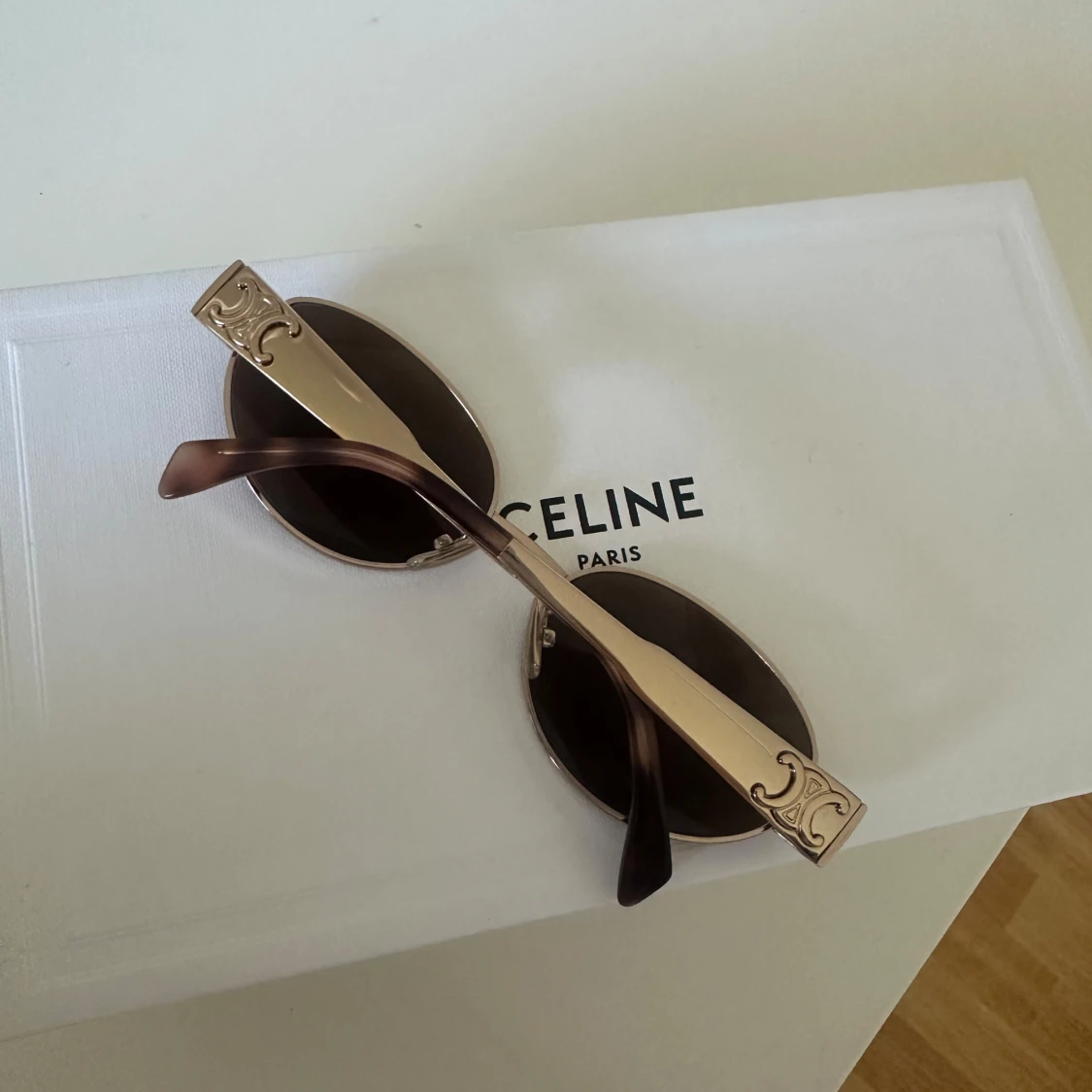 Snygga ovala solglasögon från Celine Paris med rose guld metallbågar och bruna linser. Ikonisk logga på skalmarna och exklusiv design, tillverkade i Italien. Levereras med originalfodral och tillbehör. Perfekt accessoar för en trendig look.