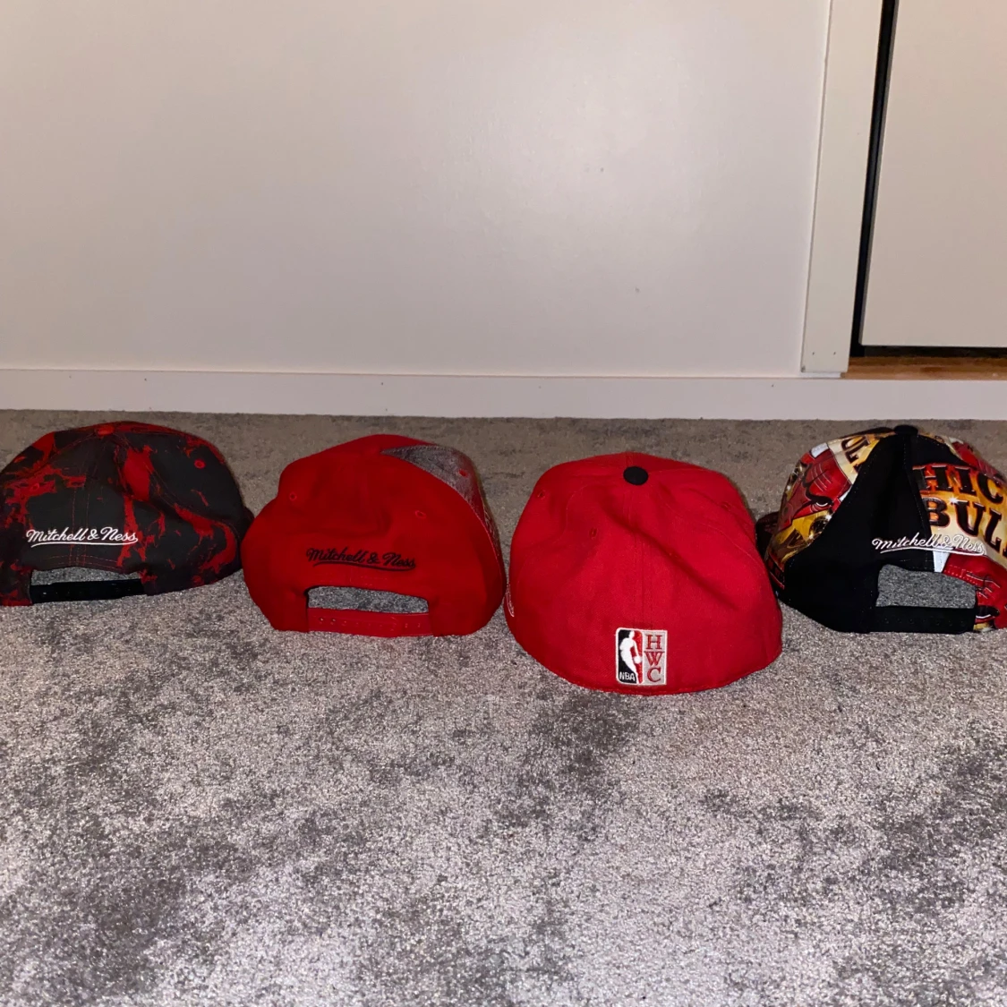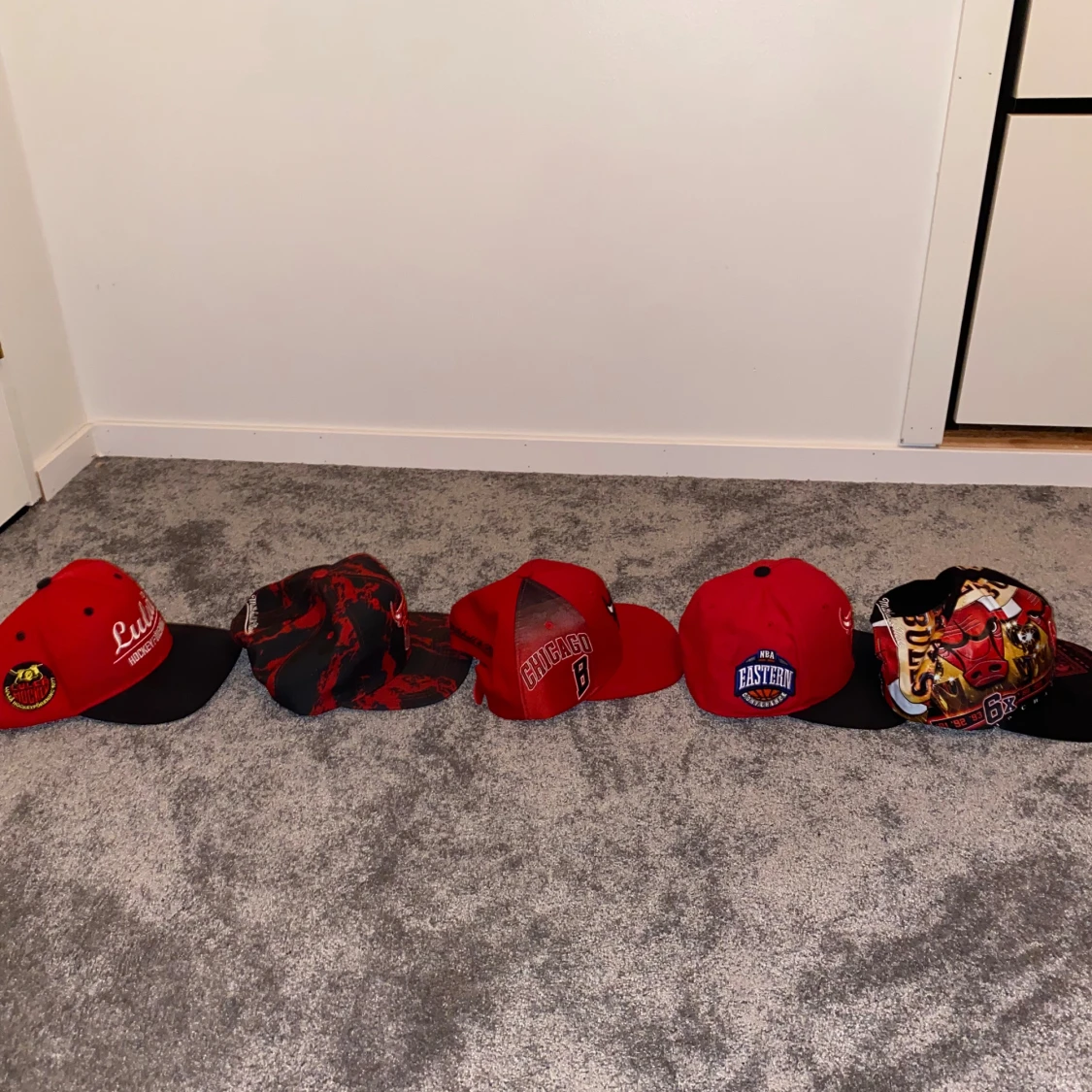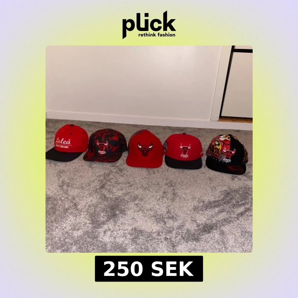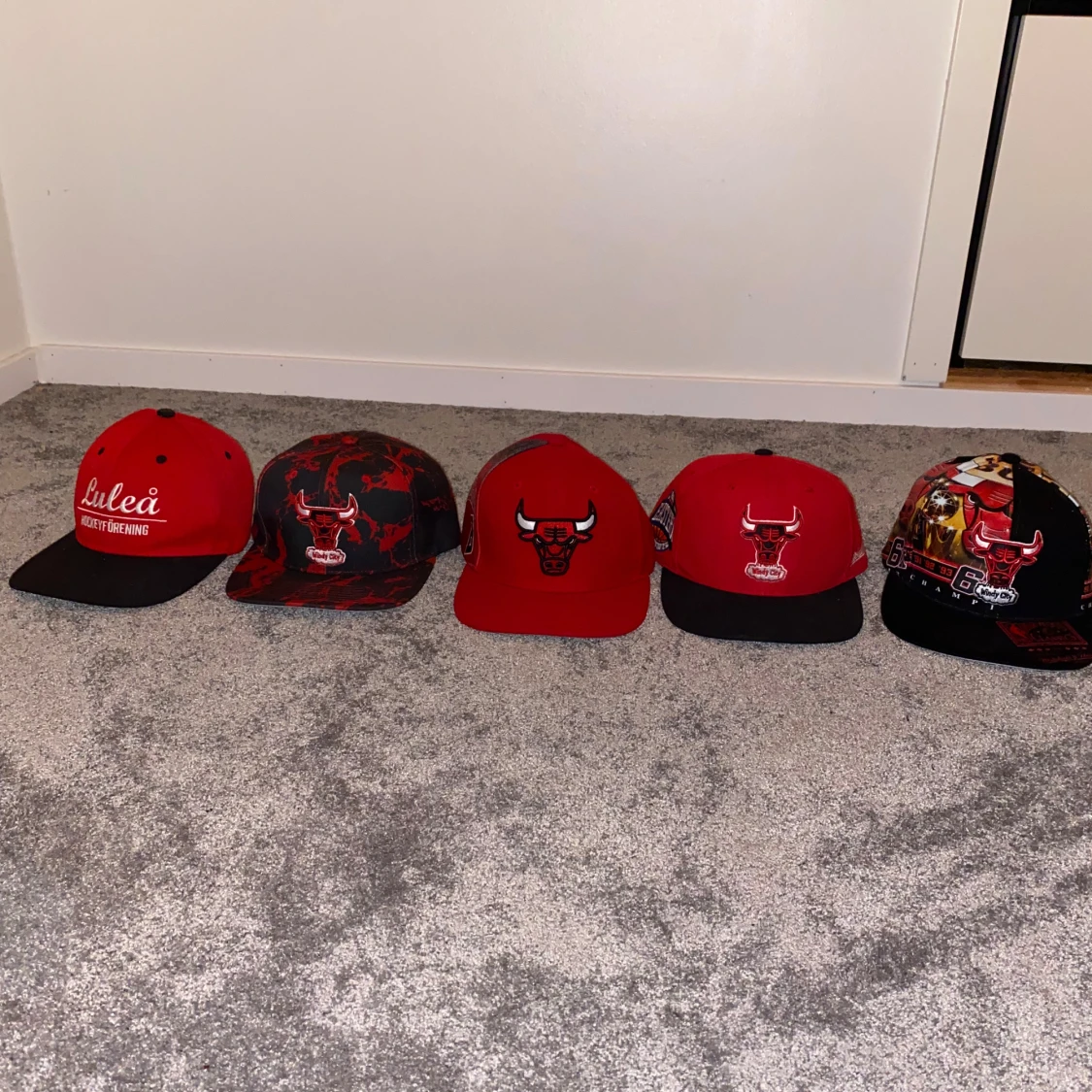 250kr/st. Samling med fem kepsar, fyra med Chicago Bulls-logga och en från Luleå Hockeyförening. Färgerna är mestadels röd och svart, med coola tryck och broderade detaljer. Några har mönster som camouflage och grafiska motiv. Alla har platt skärm och justerbar passform.