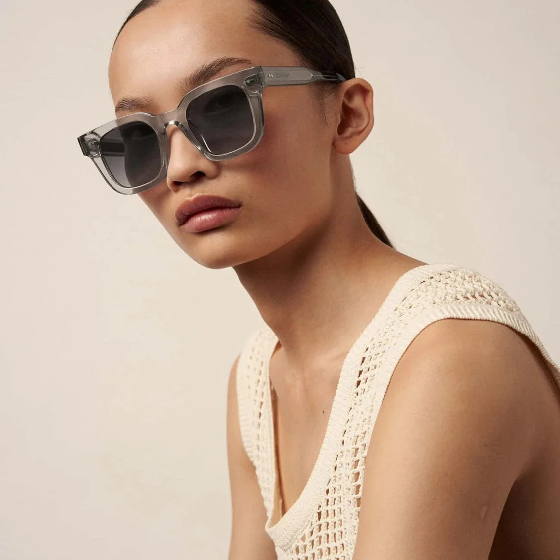 Dom är lite skadade i ena kanten där av billigt pris, inget märks eller syns vid användning. Skriv för en bättre förklaring🥰Snygga solglasögon från CHIMI med transparent grå färg Kommer med originalfodral!!🩶